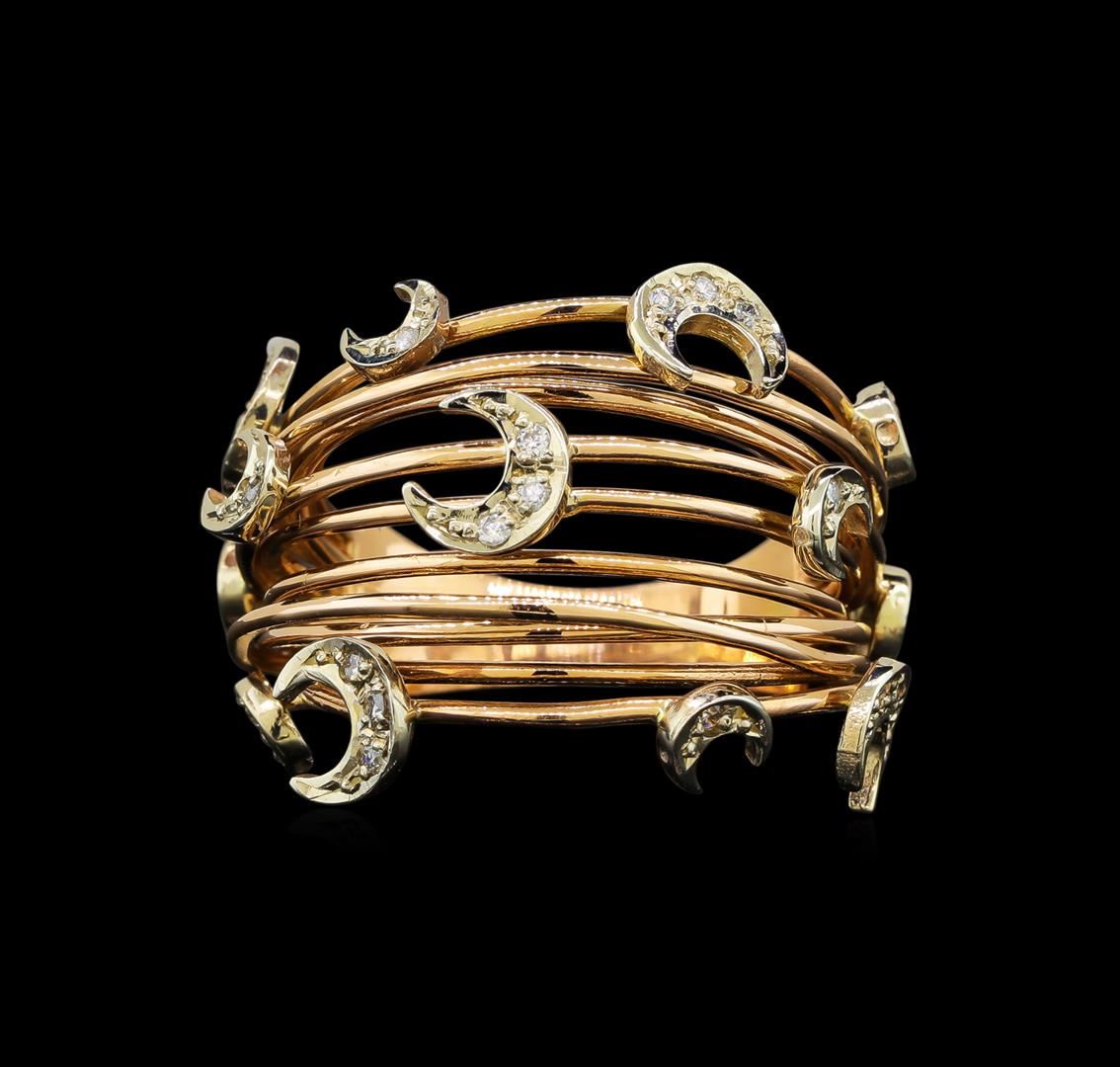 One electronically tested 14KT rose gold ladies cast diamond ring with a bright polish finish. Identified with markings of "14K". Condition is new. Containing: Twenty-Three prong set round brilliant cut diamonds, measuring 1.00 - 1.00 x 0.60mm (depth est.) approximate total weight of 23 Stones = 0.15ct. Clarity: SI-1 to I-1. Color: I - J, Cut is Good. All diamonds are graded in the mounting, unless otherwise stated. Total Weight of Diamonds 0.15ct. Total Weight of Ring 6.50 grams. GGL Appraised at $1,720.00.