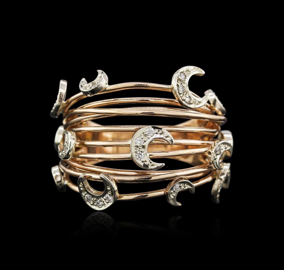 One electronically tested 14KT rose gold ladies cast diamond ring with a bright polish finish. Identified with markings of "14K". Condition is new. Containing: Twenty-Three prong set round brilliant cut diamonds, measuring 1.00 - 1.00 x 0.60mm (depth est.) approximate total weight of 23 Stones = 0.15ct. Clarity: SI-1 to I-1. Color: I - J, Cut is Good. All diamonds are graded in the mounting, unless otherwise stated. Total Weight of Diamonds 0.15ct. Total Weight of Ring 6.50 grams. GGL Appraised at $1,720.00.