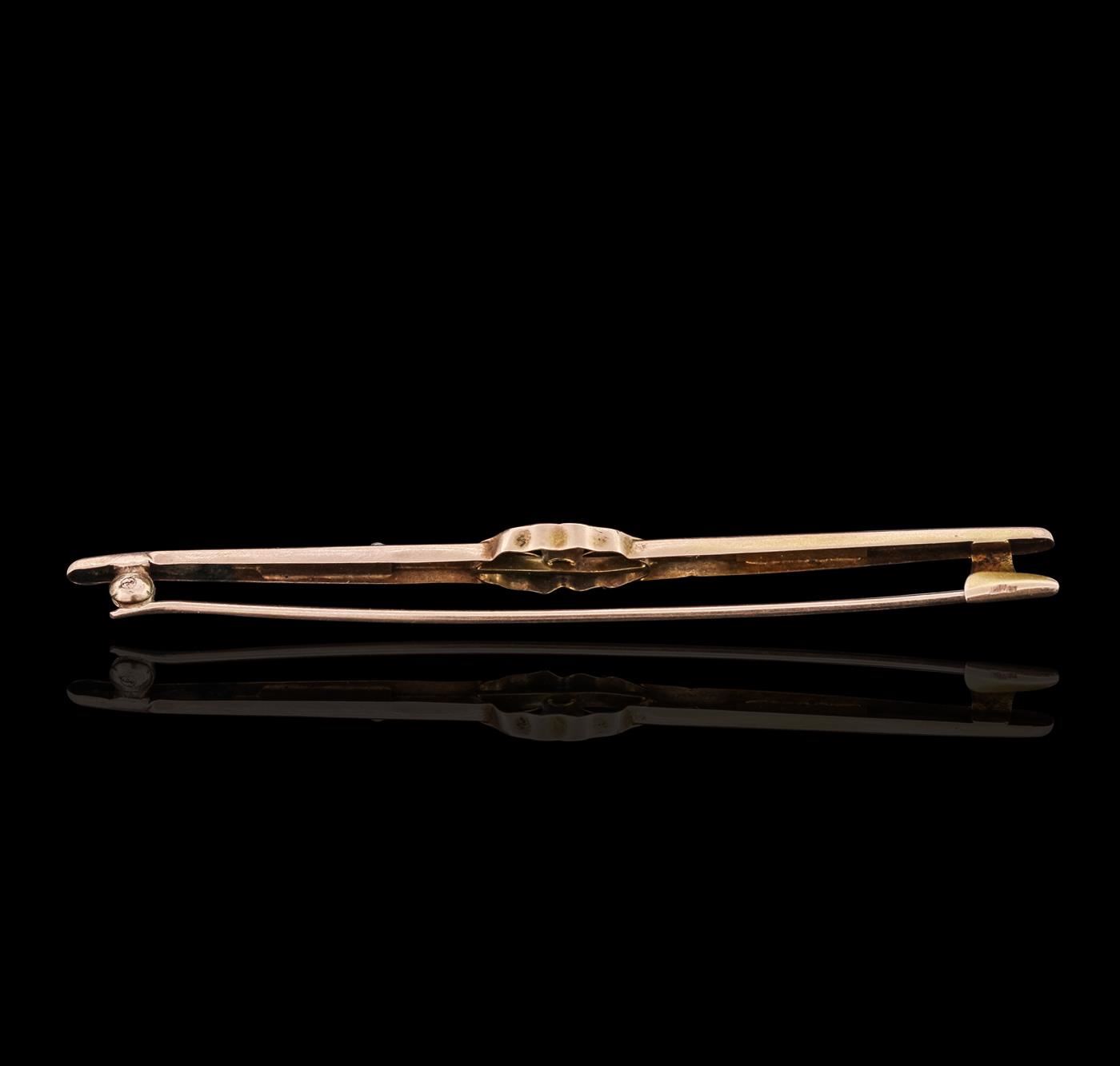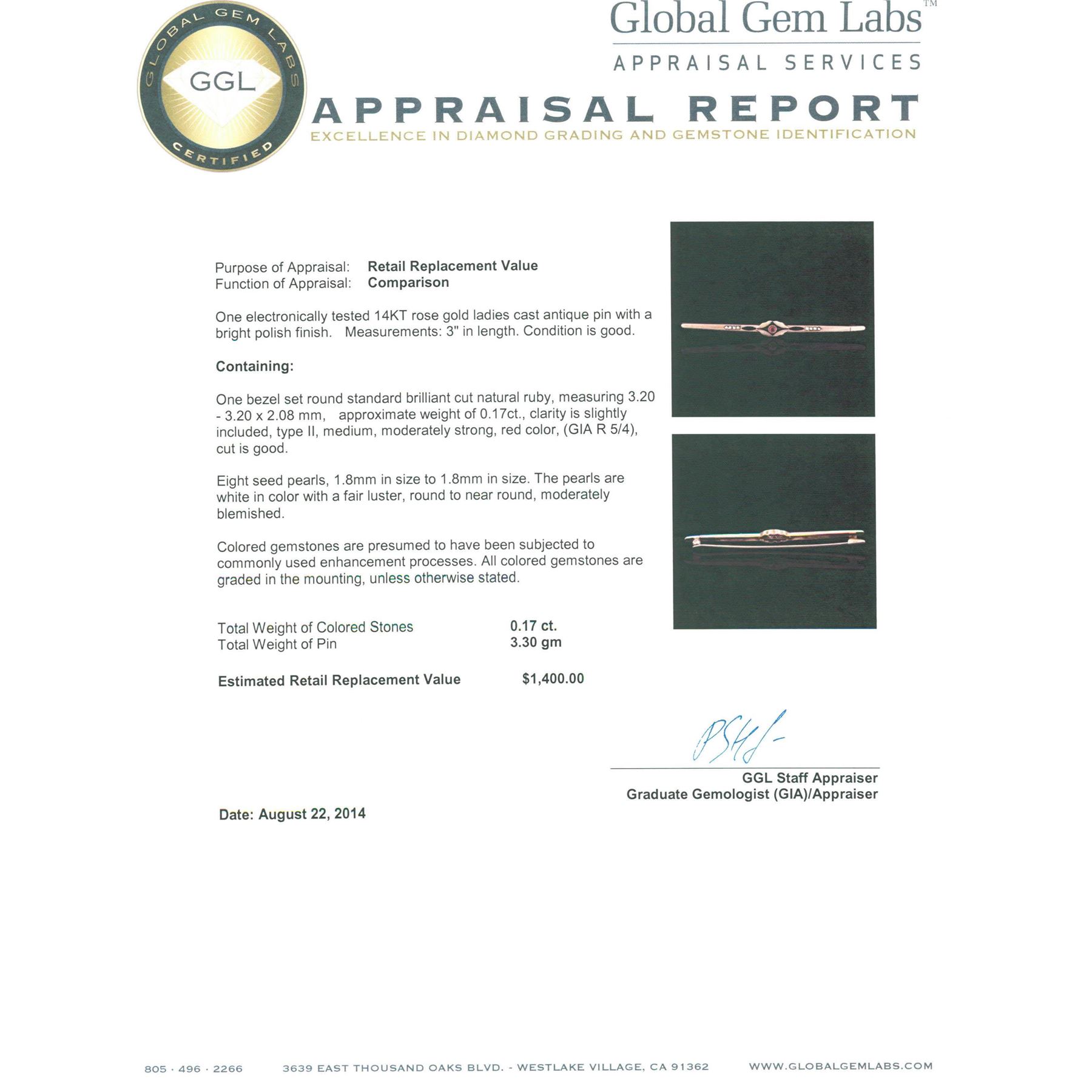 One electronically tested 14KT rose gold ladies cast antique pin with a bright polish finish. Measurements: 3" in length. Condition is good. Containing: One bezel set round standard brilliant cut natural ruby, measuring 3.20 - 3.20 x 2.08 mm, approximate weight of 0.17ct., clarity is slightly included, type II, medium, moderately strong, red color, (GIA R 5/4), cut is good. Eight seed pearls, 1.8mm in size to 1.8mm in size. The pearls are white in color with a fair luster, round to near round, moderately blemished. Colored gemstones are presumed to have been subjected to commonly used enhancement processes. All colored gemstones are graded in the mounting, unless otherwise stated. Total Weight of Colored Stones 0.17ct. Total Weight of Pin 3.30 grams. GGL Appraised.
