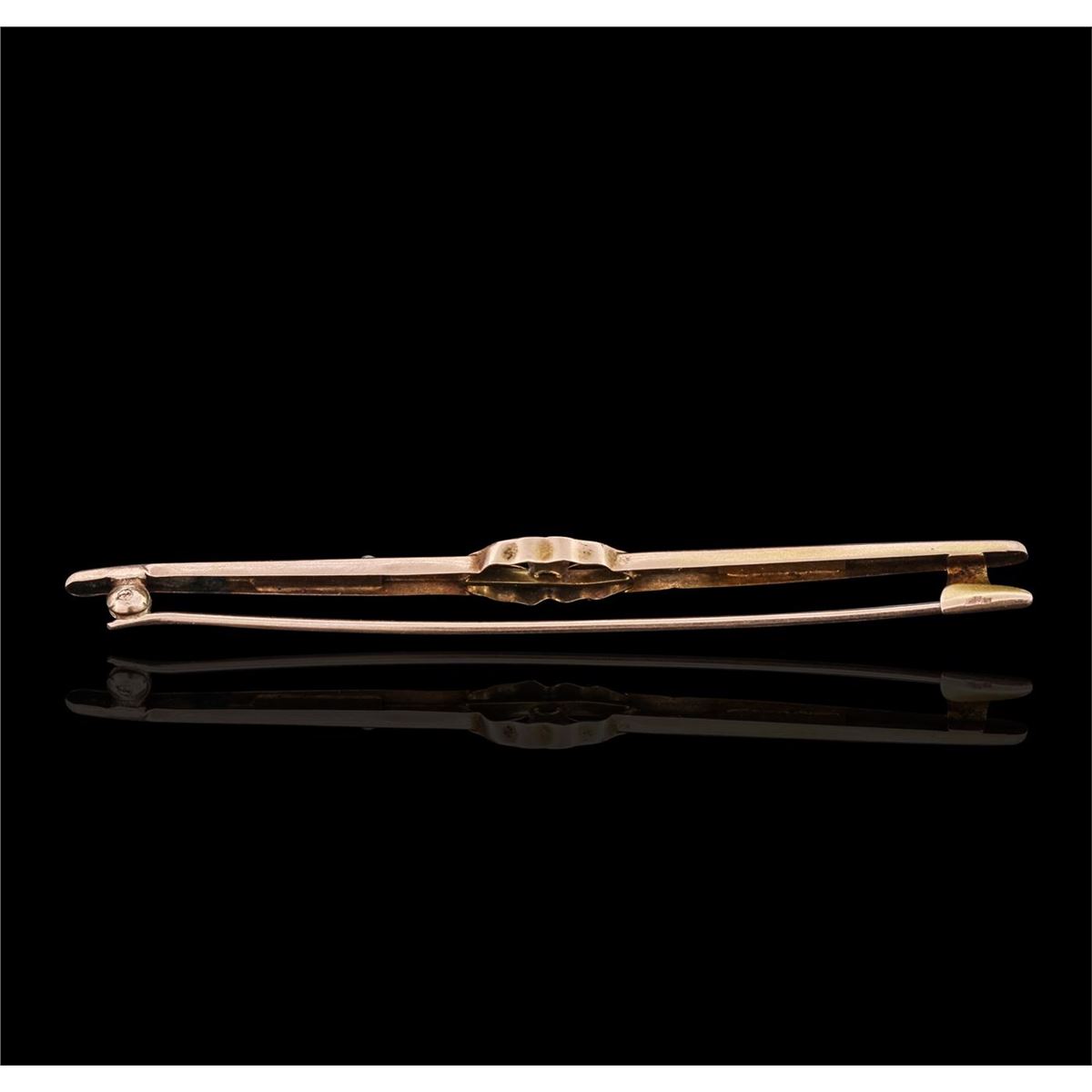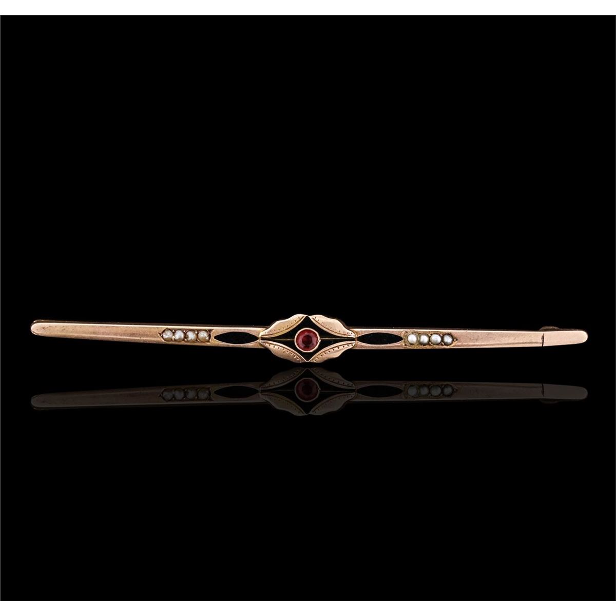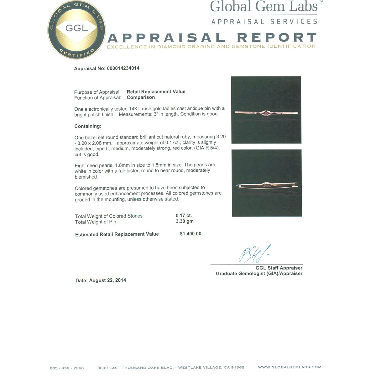 One electronically tested 14KT rose gold ladies cast antique pin with a bright polish finish. Measurements: 3" in length. Condition is good. Containing: One bezel set round standard brilliant cut natural ruby, measuring 3.20 - 3.20 x 2.08 mm, approximate weight of 0.17ct., clarity is slightly included, type II, medium, moderately strong, red color, (GIA R 5/4), cut is good. Eight seed pearls, 1.8mm in size to 1.8mm in size. The pearls are white in color with a fair luster, round to near round, moderately blemished. Colored gemstones are presumed to have been subjected to commonly used enhancement processes. All colored gemstones are graded in the mounting, unless otherwise stated. Total Weight of Colored Stones 0.17ct. Total Weight of Pin 3.30 grams. GGL Appraised at $1,400.00.