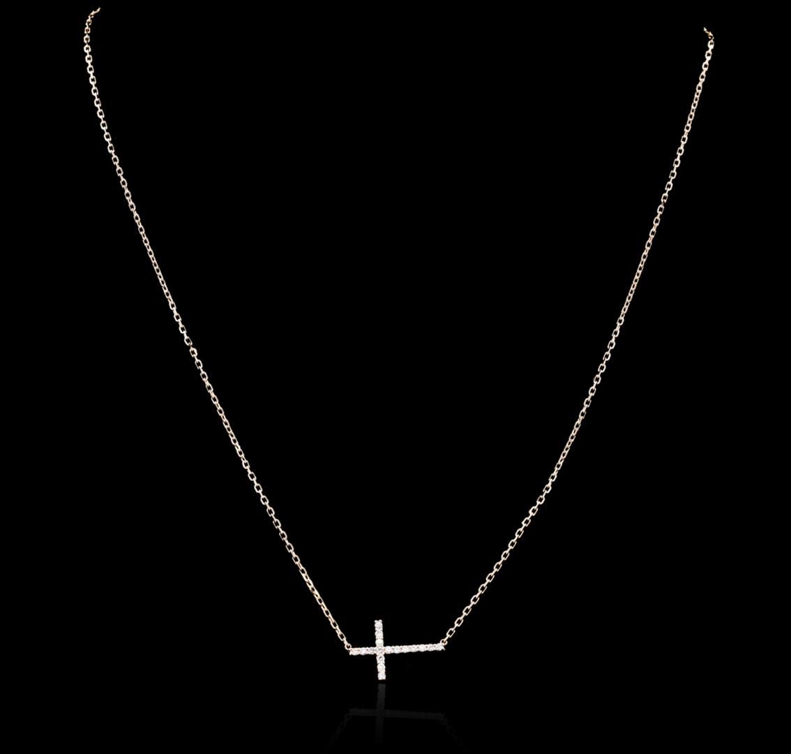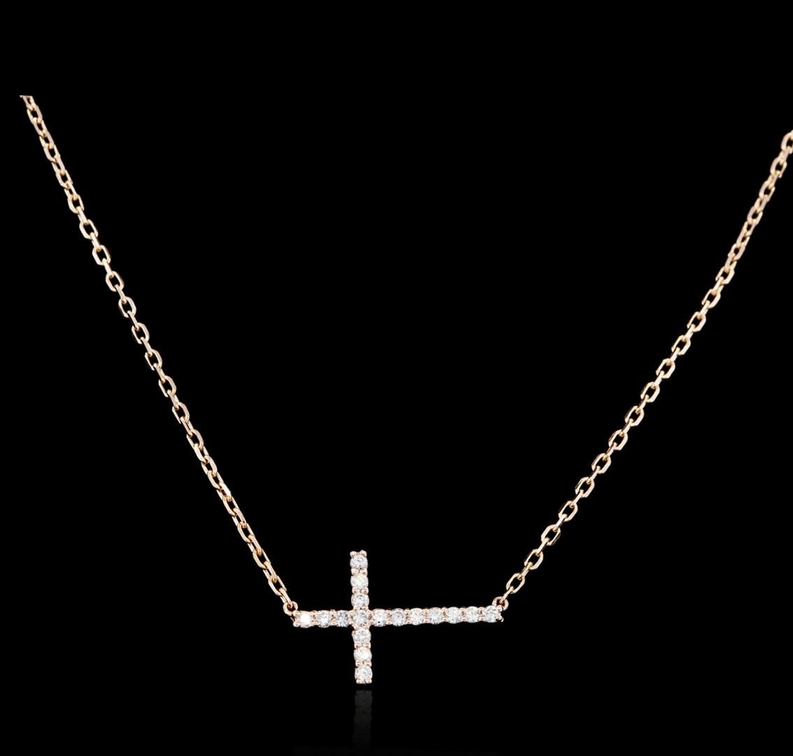 One cross necklace featuring: 14KT rose gold weighing 2.60 grams containing round diamonds with a total weight of 0.32cts.