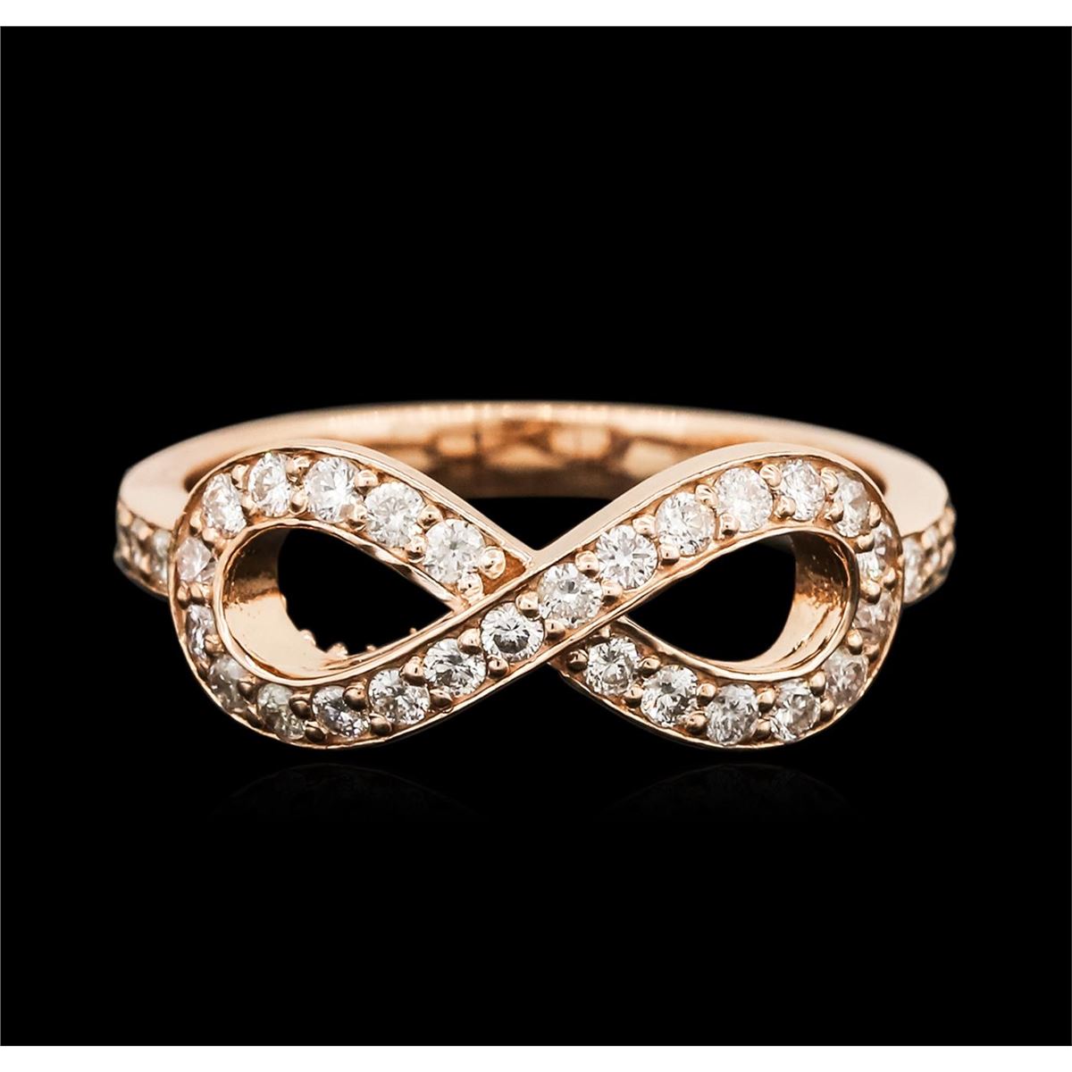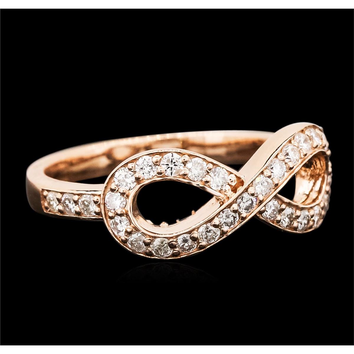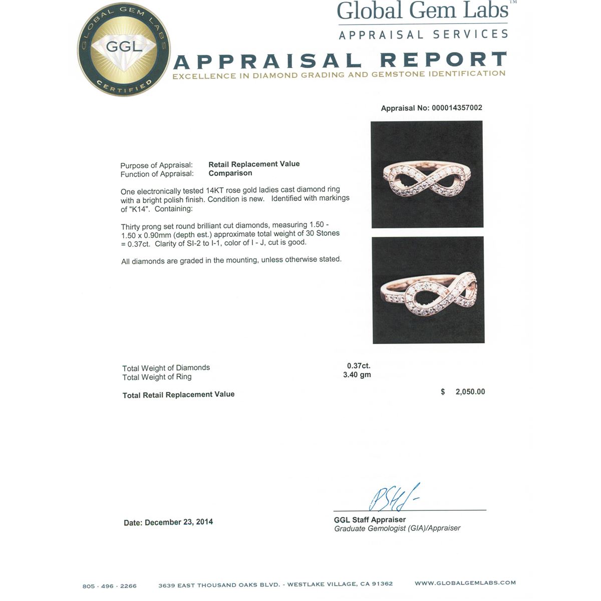One electronically tested 14KT rose gold ladies cast diamond ring with a bright polish finish. Identified with markings of "K14". Condition is new. Containing: Thirty prong set round brilliant cut diamonds, measuring 1.50 - 1.50 x 0.90mm (depth est.) approximate total weight of 30 Stones = 0.37ct. Clarity: SI-2 to I-1. Color: I - J, Cut is Good. All diamonds are graded in the mounting, unless otherwise stated. Total Weight of Diamonds 0.37ct. Total Weight of Ring 3.40 grams. GGL Appraised at $2,050.00.