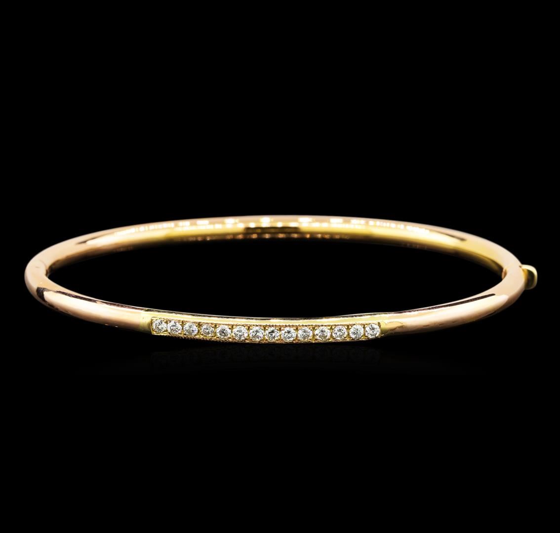 One electronically tested 14KT rose gold ladies cast diamond bangle bracelet with a hidden box clasp with a bright polish finish. Identified with markings of "14K". Condition is new. Containing: Fourteen prong set round brilliant cut diamonds, measuring 1.90 - 1.90 x 1.14mm (depth est.) approximate total weight of 14 Stones = 0.40ct. Clarity: SI-1 to SI-2. Color: I - J, Cut is Good. All diamonds are graded in the mounting, unless otherwise stated. Total Weight of Diamonds 0.40ct. Total Weight of Bangle Bracelet 8.10 grams. GGL Appraised at $1,950.00.