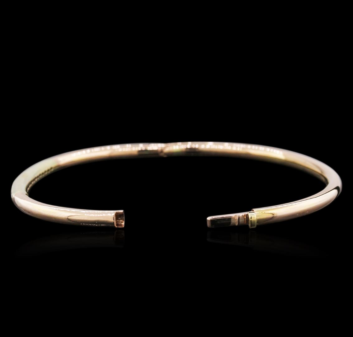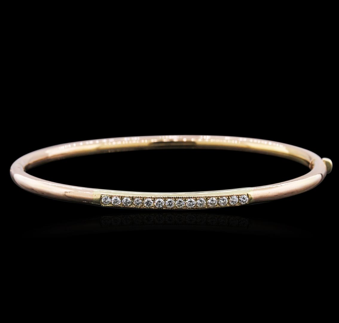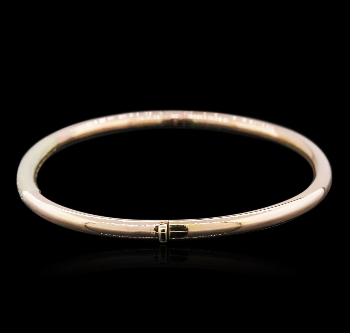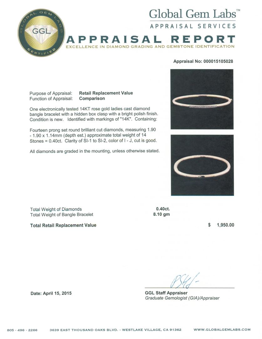 One electronically tested 14KT rose gold ladies cast diamond bangle bracelet with a hidden box clasp with a bright polish finish. Identified with markings of "14K". Condition is new. Containing: Fourteen prong set round brilliant cut diamonds, measuring 1.90 - 1.90 x 1.14mm (depth est.) approximate total weight of 14 Stones = 0.40ct. Clarity: SI-1 to SI-2. Color: I - J, Cut is Good. All diamonds are graded in the mounting, unless otherwise stated. Total Weight of Diamonds 0.40ct. Total Weight of Bangle Bracelet 8.10 grams. GGL Appraised at $1,950.00.