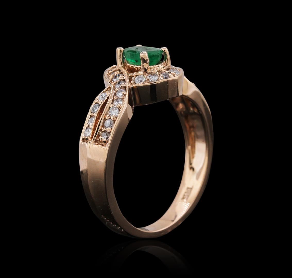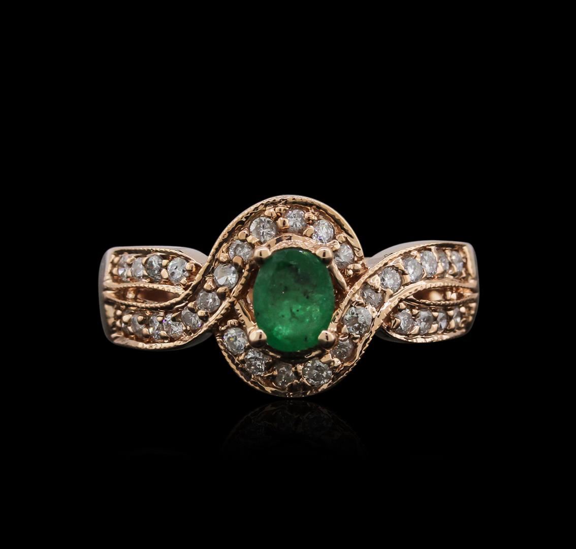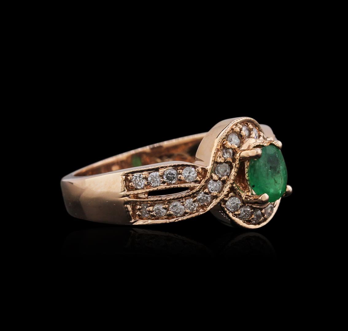 One ring featuring: 14KT rose gold weighing 5.00 grams containing one emerald center stone with a total weight of 0.42ct and 32 diamonds with a total weight of 0.33ct.