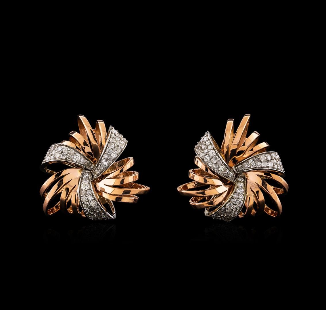 One pair electronically tested 14KT rose gold ladies combination cast & assembled earrings with Omega clip backs with posts with a bright polish finish. Condition is new. Identified with markings of "K14". Containing: Sixty-Three prong set round brilliant cut diamonds, measuring 1.30 - 1.30 x 0.78mm (depth est.) approximate. Total Weight of 63 Stones = 0.50ct. Clarity: I-1 to I-2. Color: H - I, Cut is Good. Colored gemstones are presumed to have been subjected to commonly used enhancement processes. All diamonds and colored gemstones are graded in the mounting, unless otherwise stated. Total Weight of Diamonds 0.50ct. Total Weight of Earrings 11.40 grams. GGL Appraised at $5,470.00.