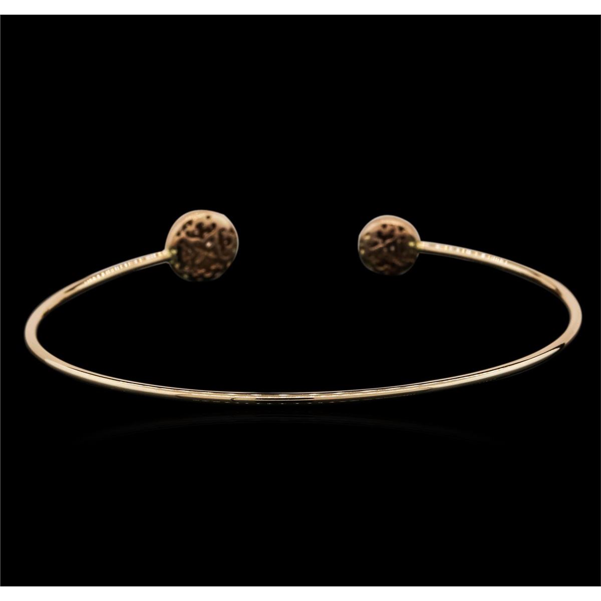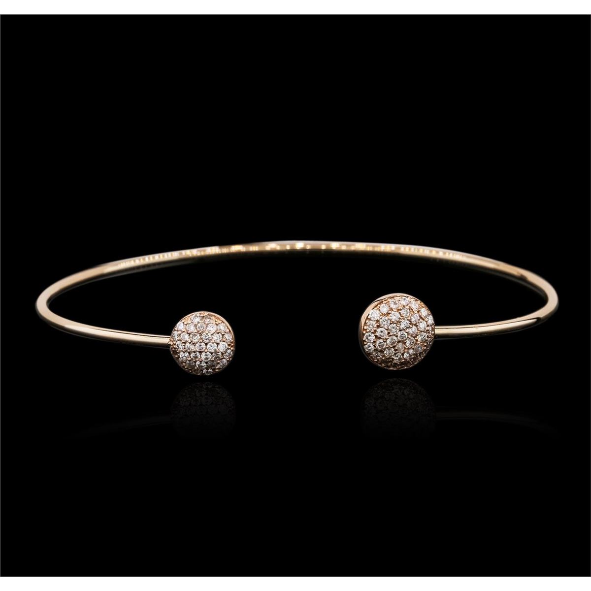 One electronically tested 14KT rose gold ladies cast diamond bangle bracelet with a bright polish finish. Condition is new. Containing: Sixty-Eight prong set round brilliant cut diamonds, measuring 1.30 - 1.30 x 0.78mm (depth est.) approximate total weight of 68 Stones = 0.54ct. Clarity: SI-1 to I-1. Color: I - J, Cut is Good. All diamonds are graded in the mounting, unless otherwise stated. Total Weight of Diamonds 0.54ct. Total Weight of Bangle Bracelet 5.20 grams. GGL Appraised at $3,140.00.