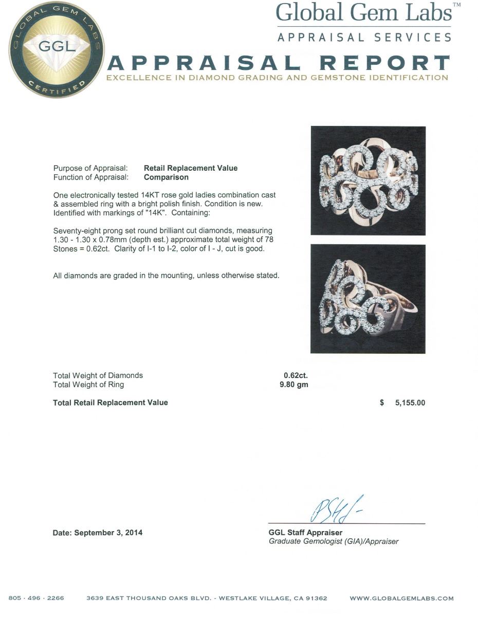 One electronically tested 14KT rose gold ladies combination cast & assembled ring with a bright polish finish. Identified with markings of "14K". Condition is new. Containing: Seventy-Eight prong set round brilliant cut diamonds, measuring 1.30 - 1.30 x 0.78mm (depth est.) approximate total weight of 78 Stones = 0.62ct. Clarity: I-1 to I-2. Color: I - J, Cut is Good. All diamonds are graded in the mounting, unless otherwise stated. Total Weight of Diamonds 0.62ct. Total Weight of Ring 9.80 grams. GGL Appraised at $5,155.00.