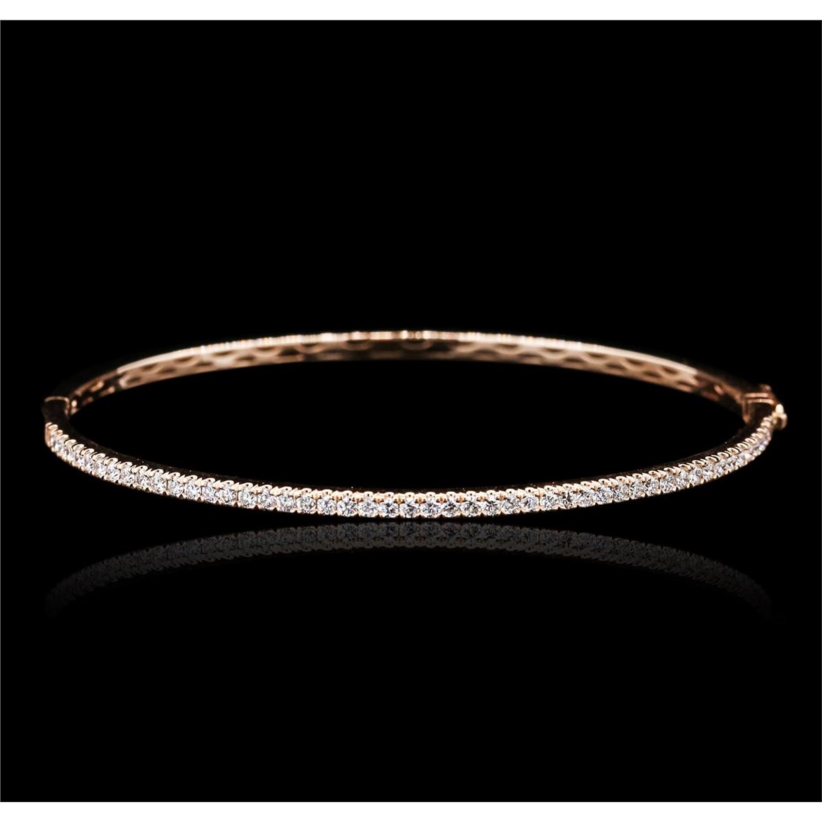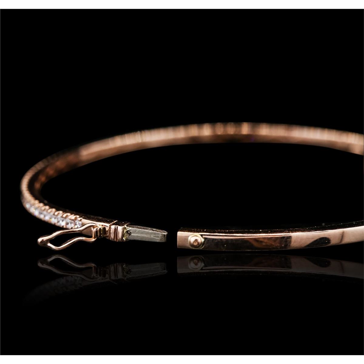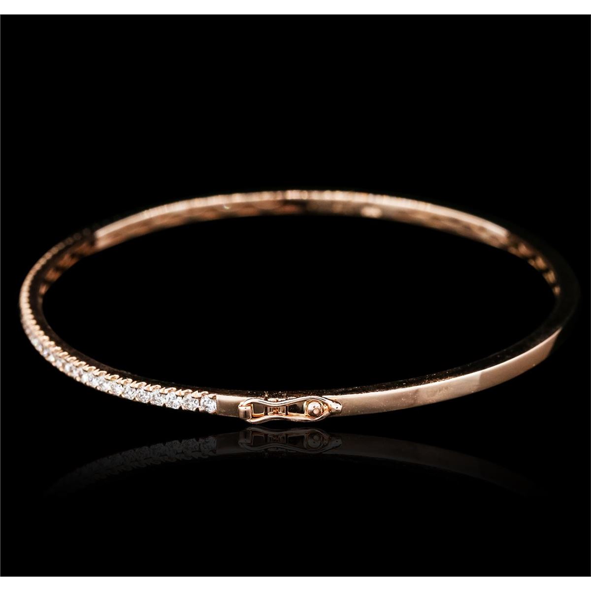 One electronically tested 14KT rose gold ladies cast & assembled diamond bangle bracelet with a bright polish finish. Six and one-half inch wearable length bangle bracelet features a diamond set curvature supported by hinged shoulders, terminating in a concealed clasp with safety. Identified with markings of "14K". Condition is new, good workmanship. Containing: Forty-Nine prong set round brilliant cut diamonds, measuring 1.60 - 1.50 x 0.93mm (depth est.) approximate total weight of 49 Stones = 0.67ct. Graded in the setting. Clarity: VS-1 to VS-2. Color: G - I. Total Weight of Diamonds 0.67ct. Total Weight of Bangle Bracelet 6.67 grams. AIG Appraised at $3,765.00.