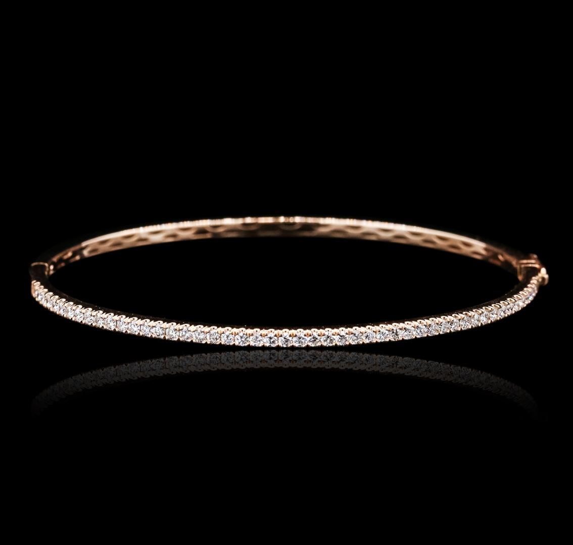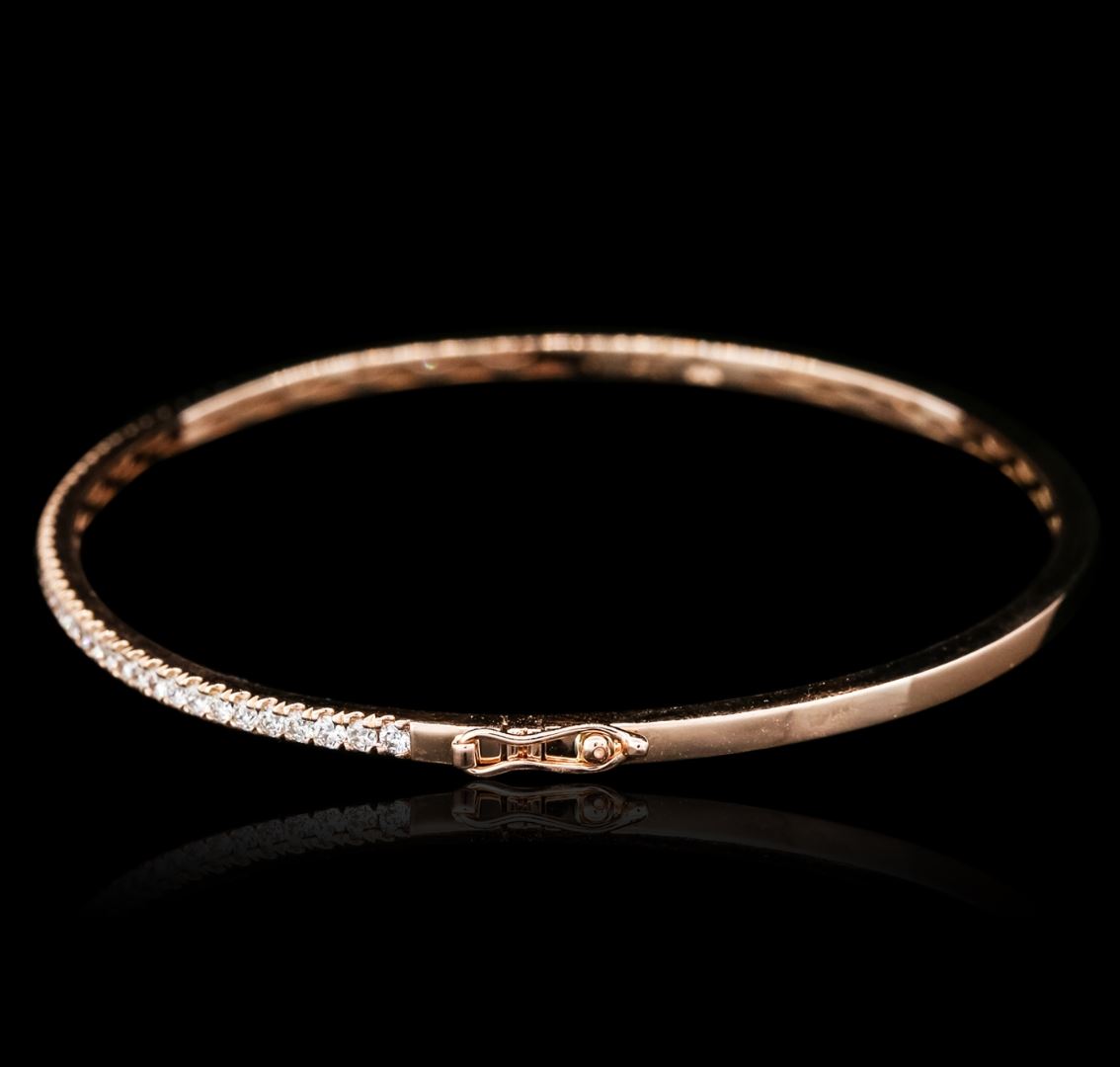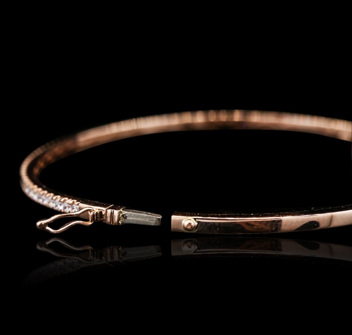 One electronically tested 14KT rose gold ladies cast & assembled diamond bangle bracelet with a bright polish finish. Six and one-half inch wearable length bangle bracelet features a diamond set curvature supported by hinged shoulders, terminating in a concealed clasp with safety. Identified with markings of "14K". Condition is new, good workmanship. Containing: Forty-Nine prong set round brilliant cut diamonds, measuring 1.60 - 1.50 x 0.93mm (depth est.) approximate total weight of 49 Stones = 0.67ct. Graded in the setting. Clarity: VS-1 to VS-2. Color: G - I. Total Weight of Diamonds 0.67ct. Total Weight of Bangle Bracelet 6.67 grams. AIG Appraised at $3,765.00.