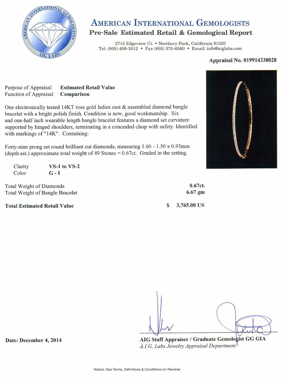 One electronically tested 14KT rose gold ladies cast & assembled diamond bangle bracelet with a bright polish finish. Six and one-half inch wearable length bangle bracelet features a diamond set curvature supported by hinged shoulders, terminating in a concealed clasp with safety. Identified with markings of "14K". Condition is new, good workmanship. Containing: Forty-Nine prong set round brilliant cut diamonds, measuring 1.60 - 1.50 x 0.93mm (depth est.) approximate total weight of 49 Stones = 0.67ct. Graded in the setting. Clarity: VS-1 to VS-2. Color: G - I. Total Weight of Diamonds 0.67ct. Total Weight of Bangle Bracelet 6.67 grams. AIG Appraised at $3,765.00.