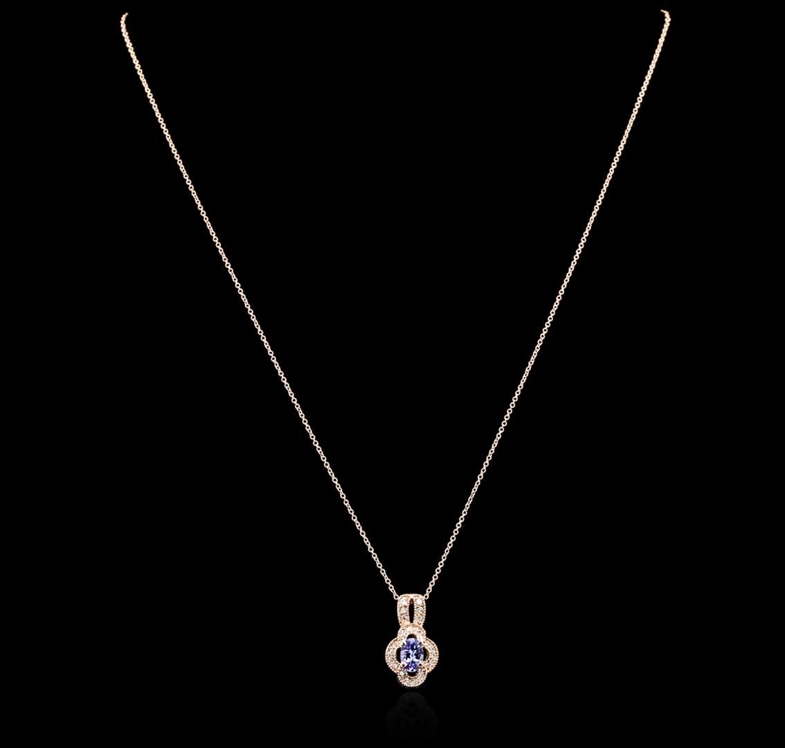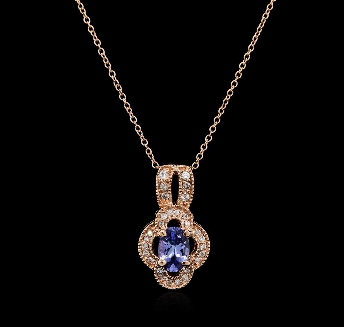 One pendant with chain featuring: 14KT rose gold weighing 3.14 grams containing one sapphire with a total weight of 0.68ct and round diamonds with a total weight of 0.16cts.