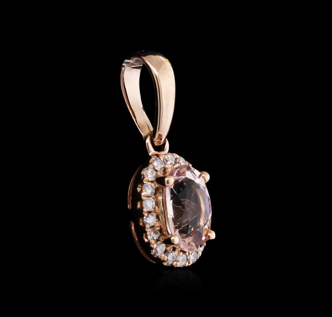 One pendant featuring: 14KT rose gold weighing 1.30 grams containing one morganite with a total weight of 0.69ct and 18 round diamonds with a total weight of 0.11ct.