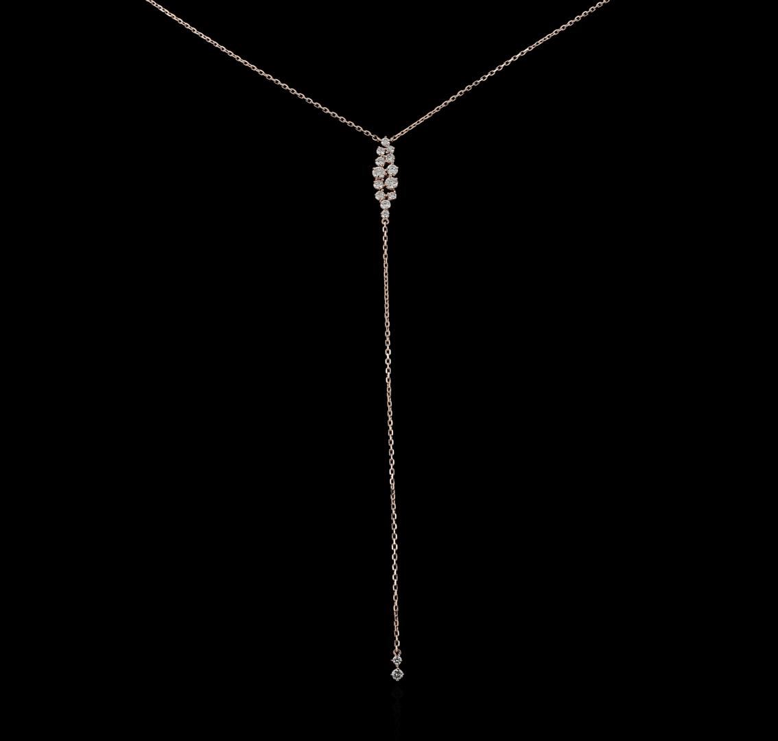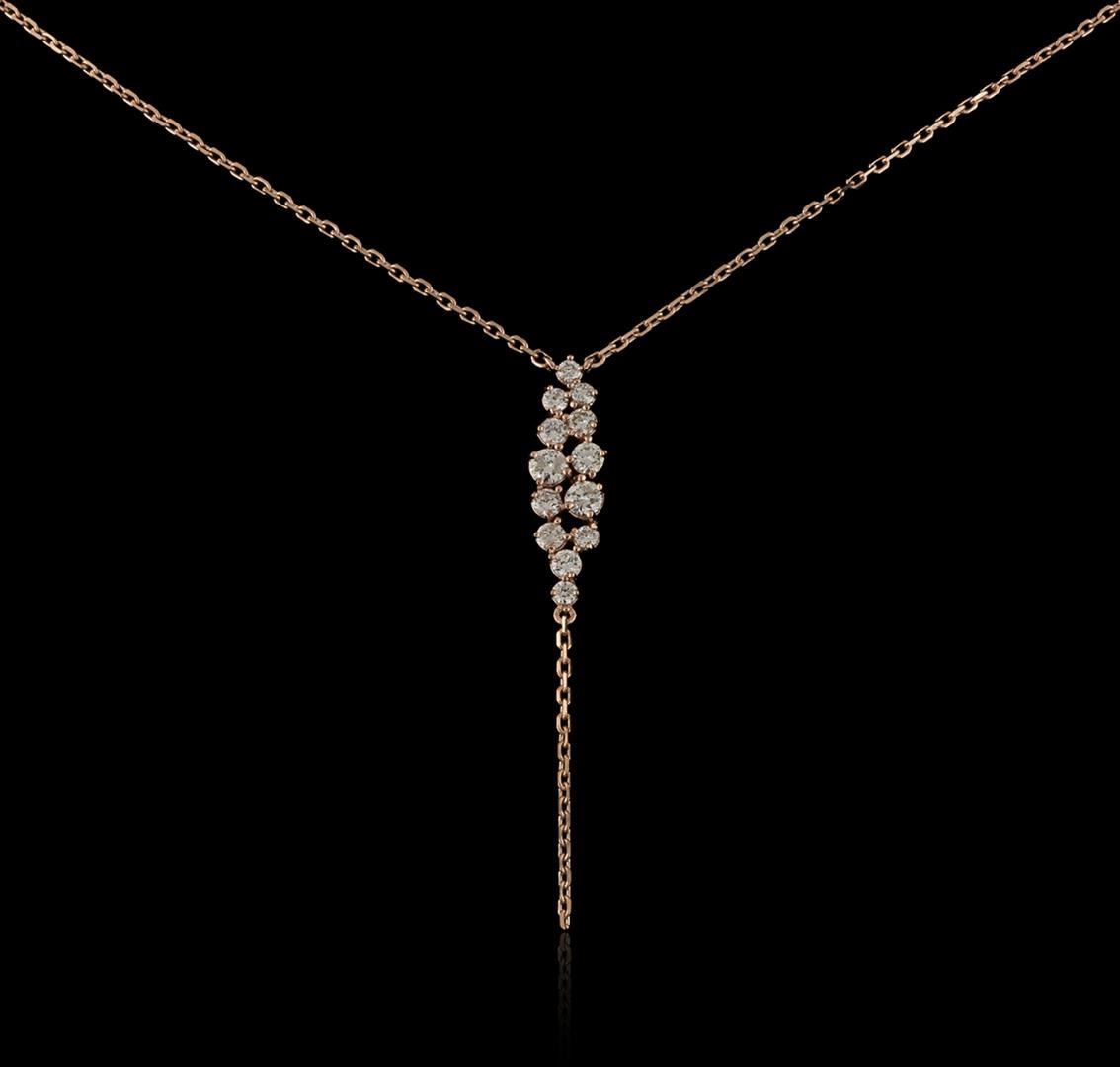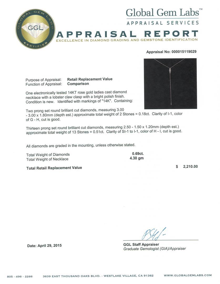 One electronically tested 14KT rose gold ladies cast diamond necklace with a lobster claw clasp with a bright polish finish. Identified with markings of "14K". Condition is new. Containing: Two prong set round brilliant cut diamonds, measuring 3.00 - 3.00 x 1.80mm (depth est.) approximate total weight of 2 Stones = 0.18ct. Clarity: I-1. Color: G - H, Cut is Good. Thirteen prong set round brilliant cut diamonds, measuring 2.50 - 1.50 x 1.20mm (depth est.) approximate total weight of 13 Stones = 0.51ct. Clarity: SI-1 to I-1. Color: H - I, Cut is Good. All diamonds are graded in the mounting, unless otherwise stated. Total Weight of Diamonds 0.69ct. Total Weight of Necklace 4.30 grams. GGL Appraised at $2,210.00.