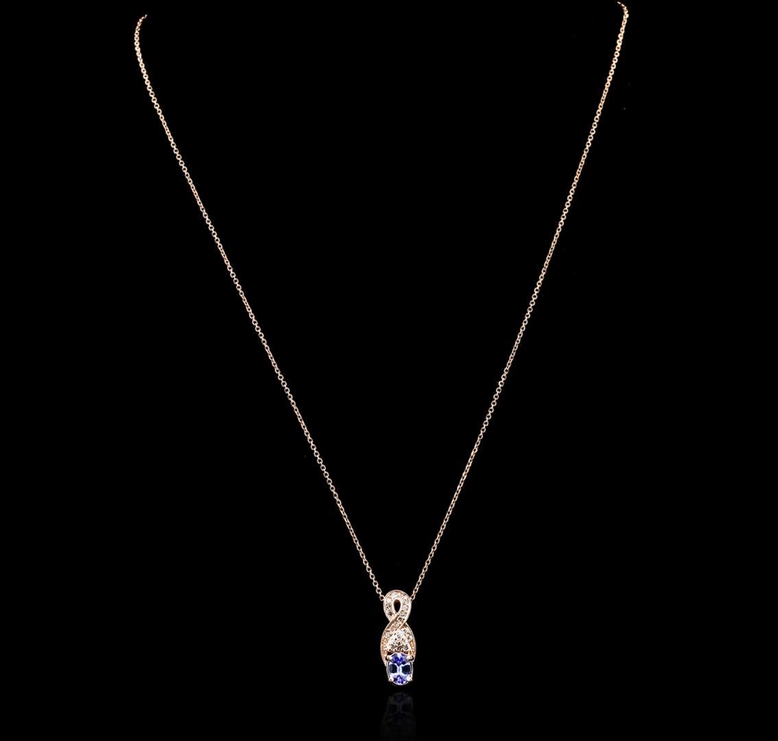 One pendant with chain featuring: 14KT rose gold weighing 3.66 grams containing one tanzanite with a total weight of 0.72ct and round diamonds with a total weight of 0.21cts.