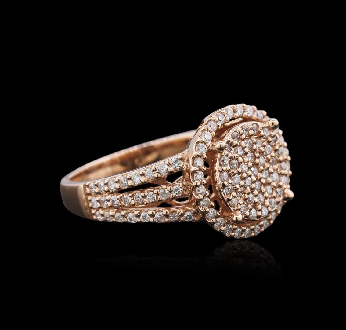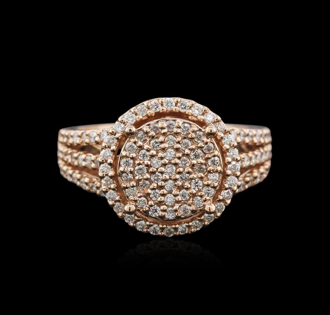 One electronically tested 14KT rose gold ladies cast diamond ring with a bright polish finish. Identified with markings of "585". Condition is new. Containing: One Hundred Thirteen prong set round brilliant cut diamonds, measuring 1.10 - 1.10 x 0.66mm (depth est.) approximate total weight of 113 Stones = 0.72ct. Clarity: I-1 to I-2. Color: I - J. All diamonds are graded in the mounting, unless otherwise stated. Total Weight of Diamonds 0.72ct. Total Weight of Ring 5.00 grams. GGL Appraised at $3,000.00.