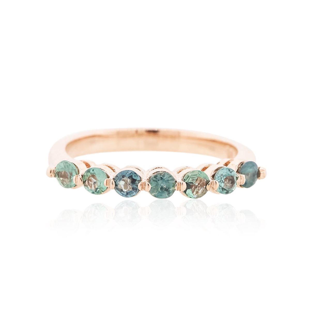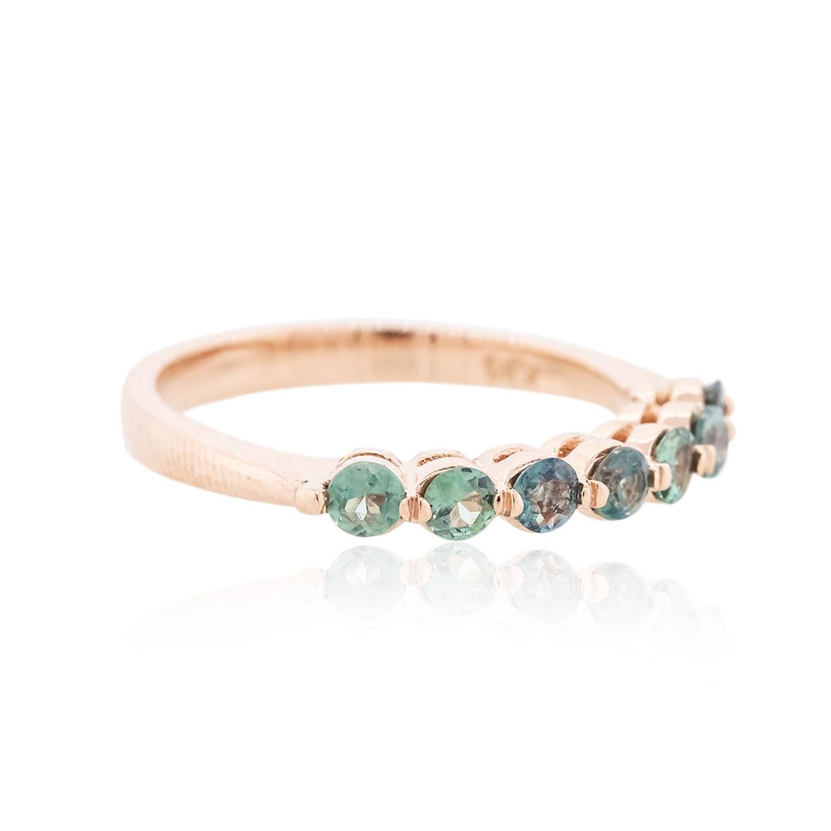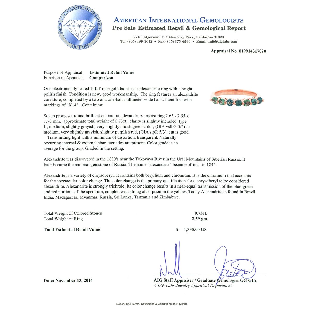 One electronically tested 14KT rose gold ladies cast alexandrite ring with a bright polish finish. The ring features an alexandrite curvature, completed by a two and one-half millimeter wide band. Identified with markings of "K14". Condition is new, good workmanship. Containing: Seven prong set round brilliant cut natural alexandrites, measuring 2.65 - 2.55 x 1.70 mm, approximate total weight of 0.73ct., clarity is slightly included, type II, medium, slightly grayish, very slightly bluish green color, (GIA vslbG 5/2) to medium, very slightly grayish, slightly purplish red, (GIA slpR 5/3), cut is good. Transmitting light with a minimum of distortion, transparent. Naturally occurring internal & external characteristics are present. Color grade is an average for the group. Graded in the setting. Alexandrite was discovered in the 1830's near the Tokovaya River in the Ural Mountains of Siberian Russia. It later became the national gemstone of Russia. The name "alexandrite" became official in 1842.Alexandrite is a variety of chrysoberyl. It contains both beryllium and chromium. It is the chromium that accounts for the spectacular color change. The color change is the primary qualification for a chrysoberyl to be considered alexandrite. Alexandrite is strongly trichroic. Its color change results in a near-equal transmission of the blue-green and red portions of the spectrum, coupled with strong absorption in the yellow. Today Alexandrite is found in Brazil, India, Madagascar, Myanmar, Russia, Sri Lanka, Tanzania and Zimbabwe. Total Weight of Colored Stones 0.73ct. Total Weight of Ring 2.59 grams. AIG Appraised at $1,335.00.
