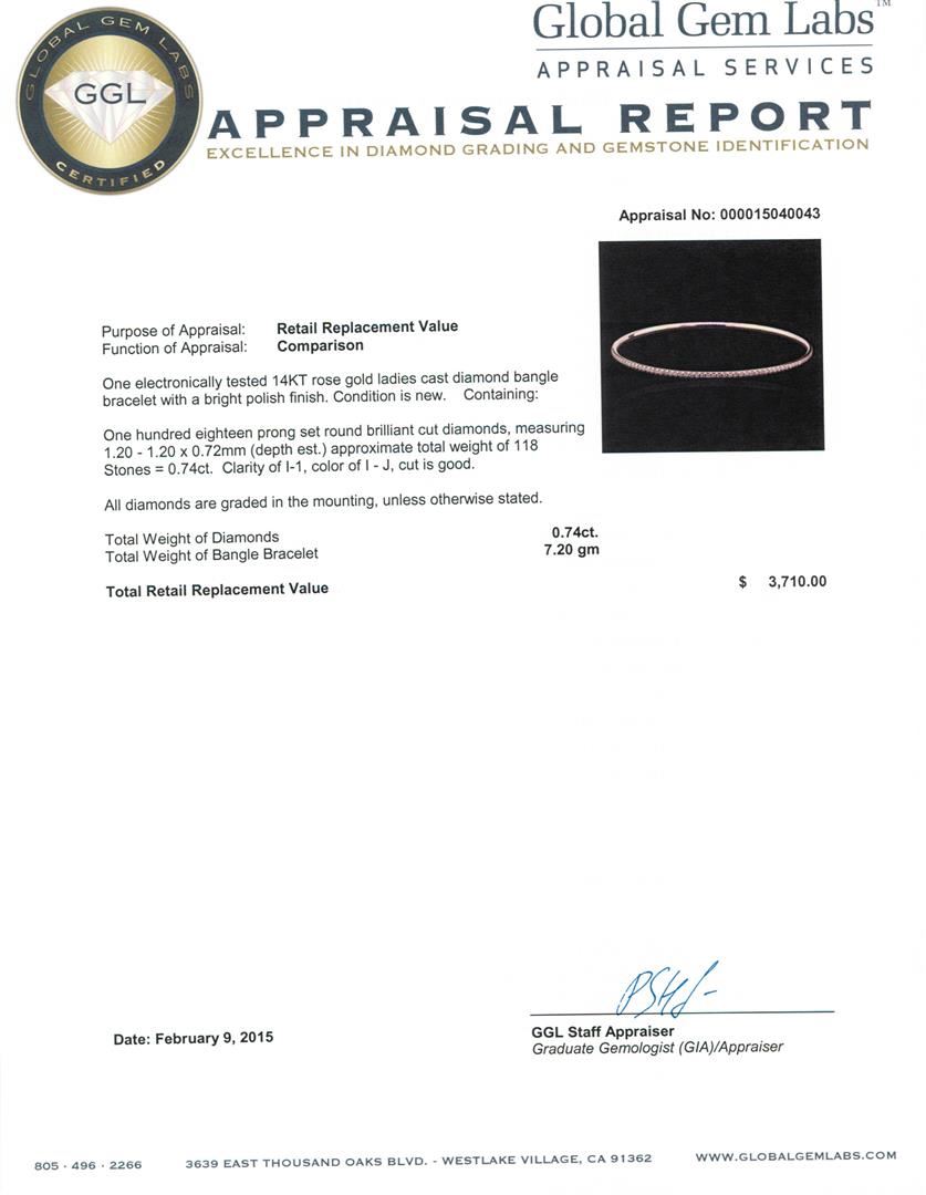 One electronically tested 14KT rose gold ladies cast diamond bangle bracelet with a bright polish finish. Condition is new. Containing: One Hundred Eighteen prong set round brilliant cut diamonds, measuring 1.20 - 1.20 x 0.72mm (depth est.) approximate total weight of 118 Stones = 0.74ct. Clarity: I-1. Color: I - J, Cut is Good. All diamonds are graded in the mounting, unless otherwise stated. Total Weight of Diamonds 0.74ct. Total Weight of Bangle Bracelet 7.20 grams. GGL Appraised at $3,710.00.