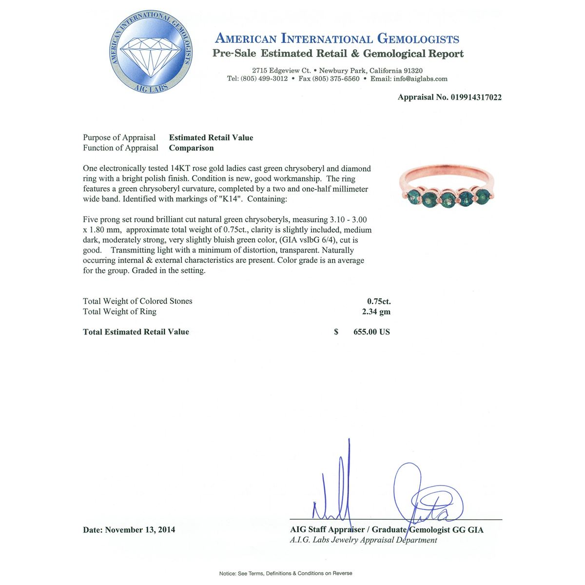 One electronically tested 14KT rose gold ladies cast green chrysoberyl and diamond ring with a bright polish finish. The ring features a green chrysoberyl curvature, completed by a two and one-half millimeter wide band. Identified with markings of "K14". Condition is new, good workmanship. Containing: Five prong set round brilliant cut natural green chrysoberyls, measuring 3.10 - 3.00 x 1.80 mm, approximate total weight of 0.75ct., clarity is slightly included, medium dark, moderately strong, very slightly bluish green color, (GIA vslbG 6/4), cut is good. Transmitting light with a minimum of distortion, transparent. Naturally occurring internal & external characteristics are present. Color grade is an average for the group. Graded in the setting. Total Weight of Colored Stones 0.75ct. Total Weight of Ring 2.34 grams. AIG Appraised at $655.00.
