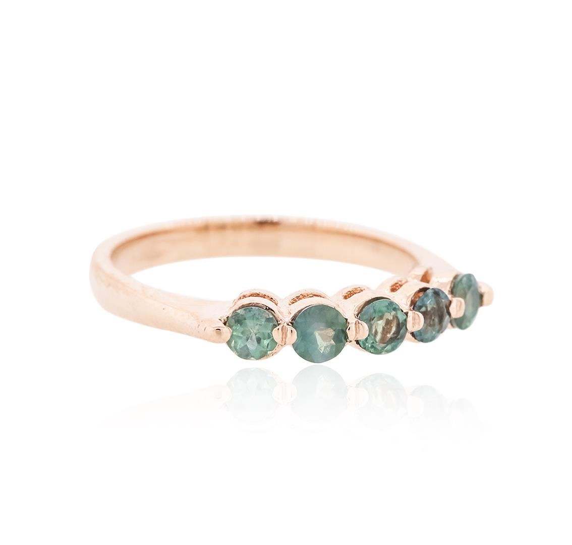 One electronically tested 14KT rose gold ladies cast green chrysoberyl and diamond ring with a bright polish finish. The ring features a green chrysoberyl curvature, completed by a two and one-half millimeter wide band. Identified with markings of "K14". Condition is new, good workmanship. Containing: Five prong set round brilliant cut natural green chrysoberyls, measuring 3.10 - 3.00 x 1.80 mm, approximate total weight of 0.75ct., clarity is slightly included, medium dark, moderately strong, very slightly bluish green color, (GIA vslbG 6/4), cut is good. Transmitting light with a minimum of distortion, transparent. Naturally occurring internal & external characteristics are present. Color grade is an average for the group. Graded in the setting. Total Weight of Colored Stones 0.75ct. Total Weight of Ring 2.34 grams. AIG Appraised at $655.00.