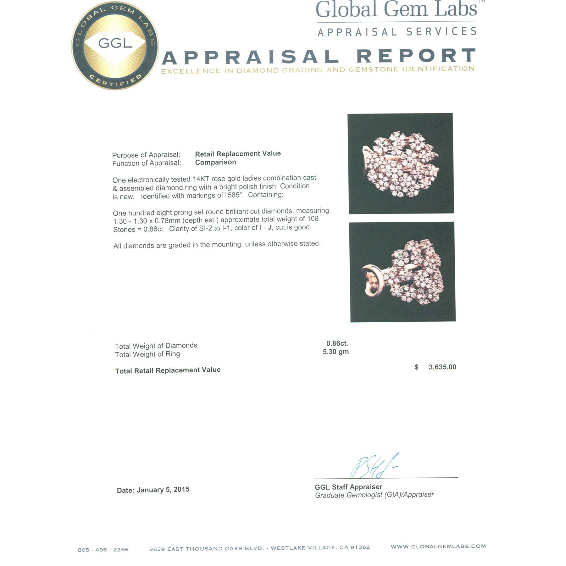 One electronically tested 14KT rose gold ladies combination cast & assembled diamond ring with a bright polish finish. Identified with markings of "585". Condition is new. Containing: One Hundred Eight prong set round brilliant cut diamonds, measuring 1.30 - 1.30 x 0.78mm (depth est.) approximate total weight of 108 Stones = 0.86ct. Clarity: SI-2 to I-1. Color: I - J, Cut is Good. All diamonds are graded in the mounting, unless otherwise stated. Total Weight of Diamonds 0.86ct. Total Weight of Ring 5.30 grams. GGL Appraised.