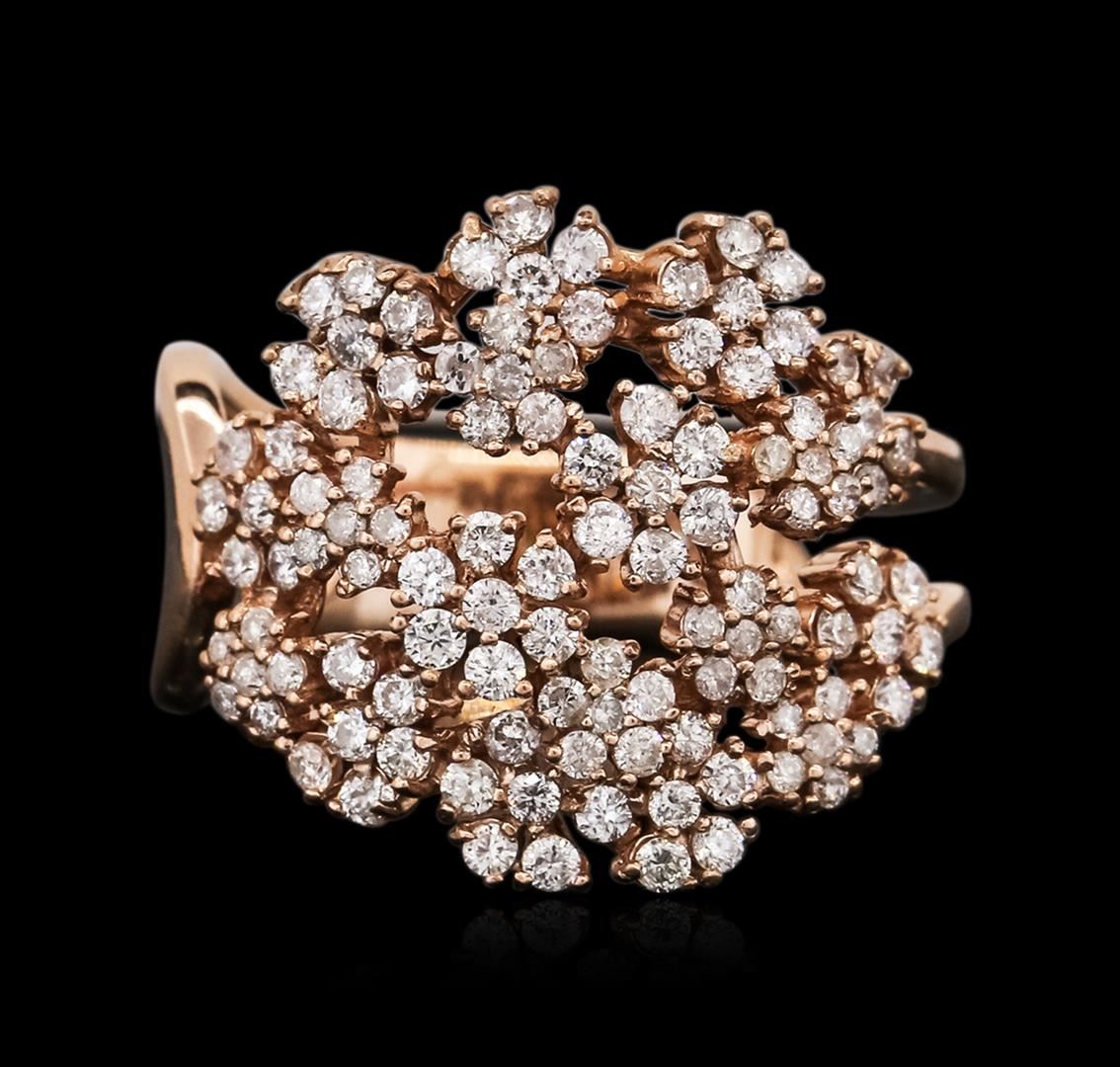 One electronically tested 14KT rose gold ladies combination cast & assembled diamond ring with a bright polish finish. Identified with markings of "585". Condition is new. Containing: One Hundred Eight prong set round brilliant cut diamonds, measuring 1.30 - 1.30 x 0.78mm (depth est.) approximate total weight of 108 Stones = 0.86ct. Clarity: SI-2 to I-1. Color: I - J, Cut is Good. All diamonds are graded in the mounting, unless otherwise stated. Total Weight of Diamonds 0.86ct. Total Weight of Ring 5.30 grams. GGL Appraised at $3,635.00.