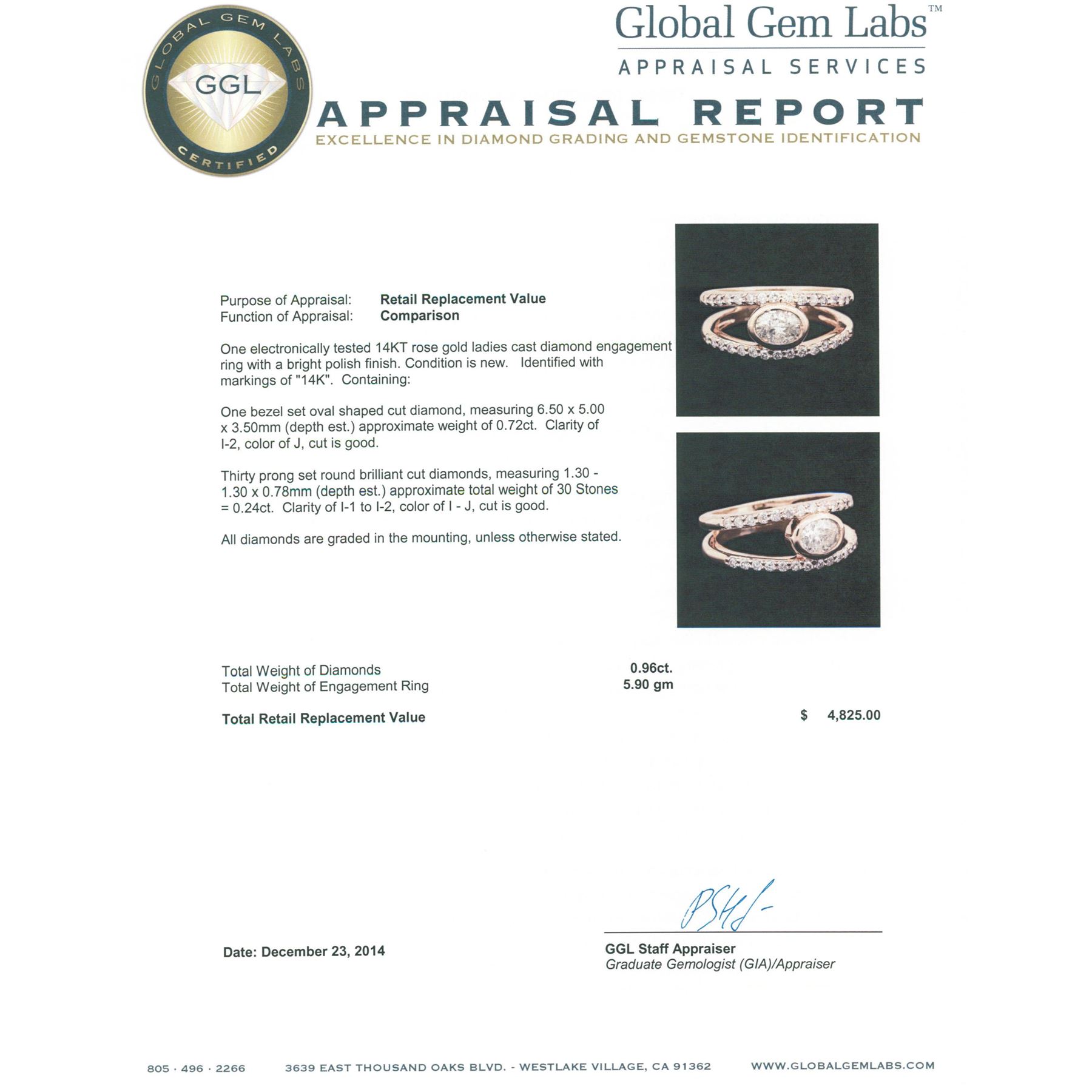 One electronically tested 14KT rose gold ladies cast diamond engagement ring with a bright polish finish. Identified with markings of "14K". Condition is new. Containing: One bezel set oval shaped cut diamond, measuring 6.50 x 5.00 x 3.50mm (depth est.) approximate weight of 0.72ct. Clarity: I-2. Color: J, Cut is Good. Thirty prong set round brilliant cut diamonds, measuring 1.30 - 1.30 x 0.78mm (depth est.) approximate total weight of 30 Stones = 0.24ct. Clarity: I-1 to I-2. Color: I - J, Cut is Good. All diamonds are graded in the mounting, unless otherwise stated. Total Weight of Diamonds 0.96ct. Total Weight of Engagement Ring 5.90 grams. GGL Appraised at $4,825.00.