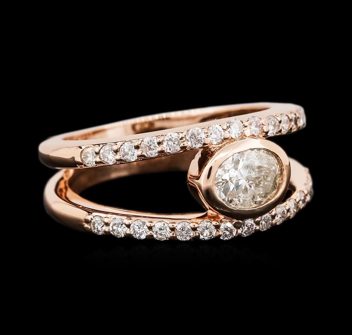 One electronically tested 14KT rose gold ladies cast diamond engagement ring with a bright polish finish. Identified with markings of "14K". Condition is new. Containing: One bezel set oval shaped cut diamond, measuring 6.50 x 5.00 x 3.50mm (depth est.) approximate weight of 0.72ct. Clarity: I-2. Color: J, Cut is Good. Thirty prong set round brilliant cut diamonds, measuring 1.30 - 1.30 x 0.78mm (depth est.) approximate total weight of 30 Stones = 0.24ct. Clarity: I-1 to I-2. Color: I - J, Cut is Good. All diamonds are graded in the mounting, unless otherwise stated. Total Weight of Diamonds 0.96ct. Total Weight of Engagement Ring 5.90 grams. GGL Appraised at $4,825.00.