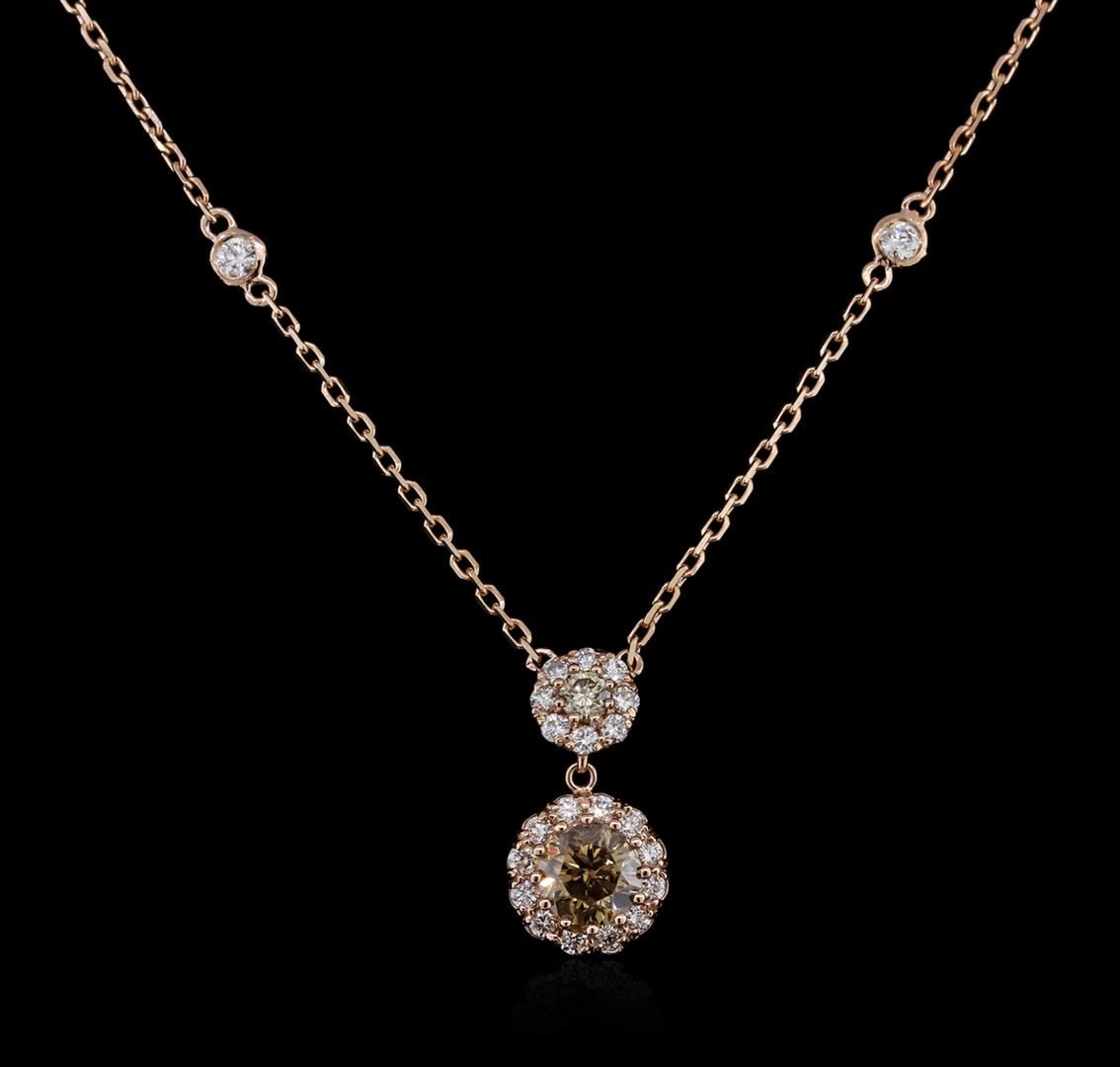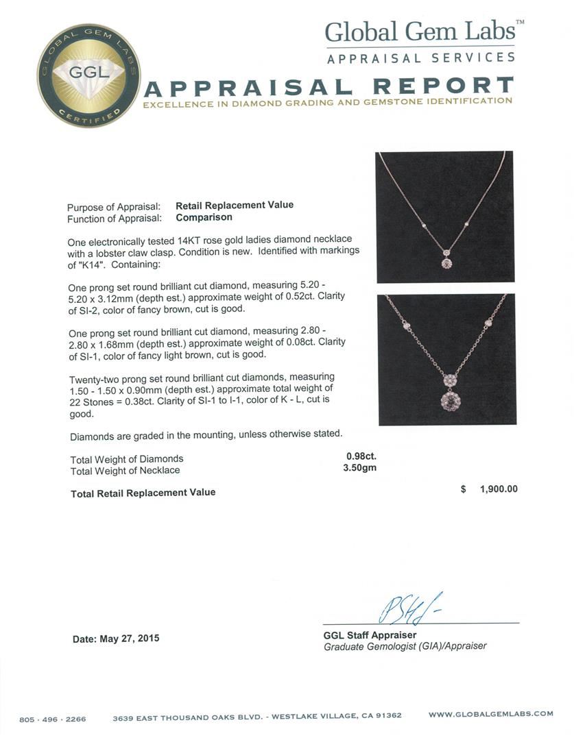 One electronically tested 14KT rose gold ladies diamond necklace with a lobster claw clasp. Identified with markings of "K14". Condition is new. Containing: One prong set round brilliant cut diamond, measuring 5.20 - 5.20 x 3.12mm (depth est.) approximate weight of 0.52ct. Clarity: SI-2, Cut is Good. One prong set round brilliant cut diamond, measuring 2.80 - 2.80 x 1.68mm (depth est.) approximate weight of 0.08ct. Clarity: SI-1, Cut is Good. Twenty-Two prong set round brilliant cut diamonds, measuring 1.50 - 1.50 x 0.90mm (depth est.) approximate total weight of 22 Stones = 0.38ct. Clarity: SI-1 to I-1. Color: K - L, Cut is Good. Diamonds are graded in the mounting, unless otherwise stated. Total Weight of Diamonds 0.98ct. Total Weight of Necklace 3.50 grams. GGL Appraised at $1,900.00.