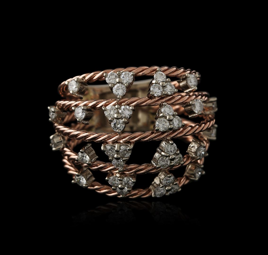 One electronically tested 14KT rose gold ladies cast diamond ring with a bright polish finish. Identified with markings of "k14". Condition is new. Containing: Thirty-Six prong set round brilliant cut diamonds, measuring 2.00 - 2.00 x 1.20mm (depth est.) approximate total weight of 36 Stones = 1.00ct. Clarity: SI-2 to I-1. Color: I - J, Cut is Good. Diamonds are graded in the mounting, unless otherwise stated. Total Weight of Diamonds 1.00ct. Total Weight of Ring 7.80 grams. GGL Appraised at $3,140.00.