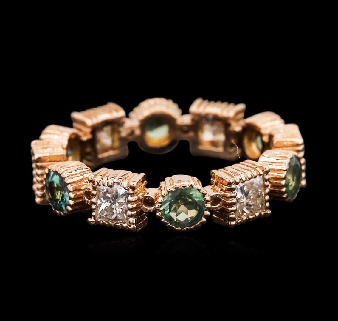 One electronically tested 14KT rose gold ladies cast green chrysoberyl and diamond ring. The ring features a continuous four millimeter wide green chrysoberyl and diamond ribbon. Bright polish finish with milgrain detailing. Condition is new, good workmanship. Containing: Six bezel set round brilliant cut natural green chrysoberyls, measuring 3.30 - 3.20 x 2.11 mm, approximate total weight of 1.02ct., clarity is slightly included, medium dark, very slightly grayish, very slightly bluish green color, (GIA vslbG 6/3), cut is good. Transmitting light with a minimum of distortion, transparent. Naturally occurring internal & external characteristics are present. Color grade is an average for the group. Graded in the setting. Six bezel set princess cut diamonds, measuring 3.30 x 3.10 x 2.00mm (depth est.) approximate total weight of 6 Stones = 1.10ct. Graded in the setting. Clarity: I-1 to I-2. Color: G - I. Total Weight of Colored Stones 1.02ct. Total Weight of Diamonds 1.10ct. Total Weight of Ring 2.96 grams. AIG Appraised at $2,540.00.