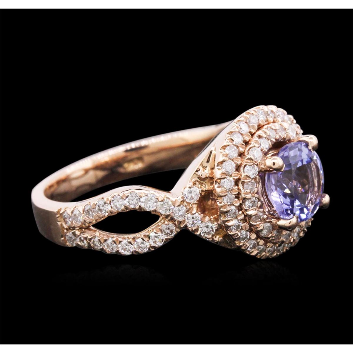 One electronically tested 14KT rose gold ladies cast tanzanite and diamond ring with a bright polish finish. Identified with markings of "14K". Condition is new. Containing: One prong set round modified brilliant cut natural tanzanite, measuring 6.50 - 6.50 x 4.23 mm, approximate weight of 1.20ct., clarity is eye clean, type I, medium light, very slightly grayish, violet color, (GIA V 4/3), cut is good. Eighty-Eight prong set round brilliant cut diamonds, measuring 1.30 - 1.30 x 0.78mm (depth est.) approximate total weight of 88 Stones = 0.70ct. Clarity: SI-2 to I-1. Color: I - J, Cut is Good. Colored gemstones are presumed to have been subjected to commonly used enhancement processes. All diamonds and colored gemstones are graded in the mounting, unless otherwise stated. Total Weight of Colored Stones 1.20ct. Total Weight of Diamonds 0.70ct. Total Weight of Ring 7.40 grams. GGL Appraised at $4,740.00.