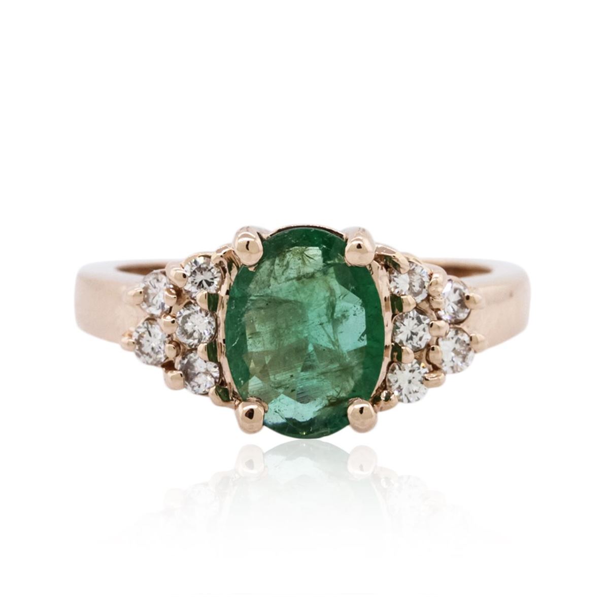 One ring featuring: 14KT rose gold weighing 5.00 grams containing one prong set oval cut emerald with a total weight of 1.21ct and prong set round cut diamonds with a total weight of 0.54cts.