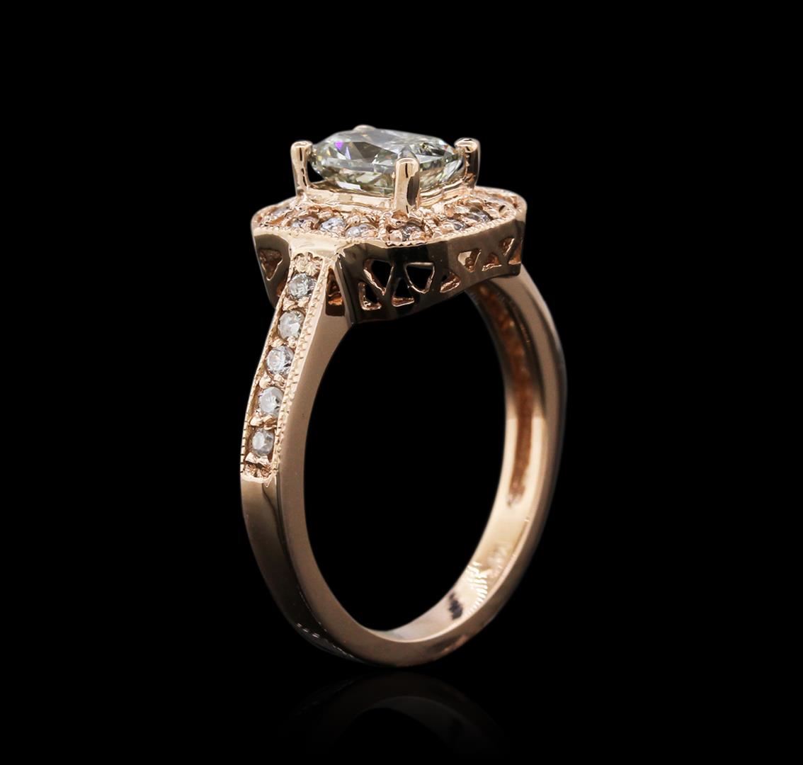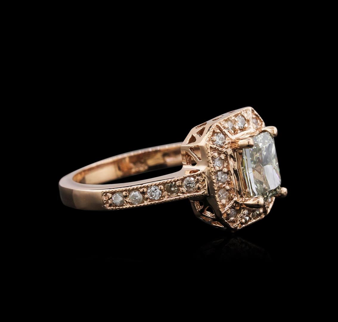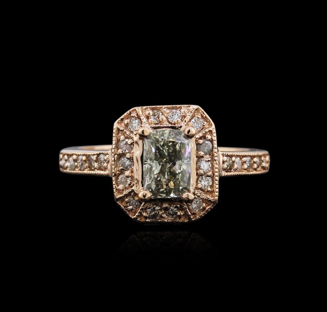 One electronically tested 14KT rose gold ladies cast diamond ring with a bright polish finish. Identified with markings of "14K". Condition is new. Containing: One prong set cushion cut diamond, measuring 6.80 x 4.90 x 3.68mm (depth est.) approximate weight of 1.04ct. Clarity: SI-2, color of Fancy Light Green, Cut is Good. Whether the color of this diamond is of natural origin or an artificial process cannot currently be determined. Twenty-Eight prong set round brilliant cut diamonds, measuring 1.30 - 1.30 x 0.78mm (depth est.) approximate total weight of 28 Stones = 0.22ct. Clarity: SI-2 to I-1. Color: J - K, Cut is Good. All diamonds are graded in the mounting, unless otherwise stated. Total Weight of Diamonds 1.27ct. Total Weight of Ring 4.50 grams. GGL Appraised at $4,580.00.