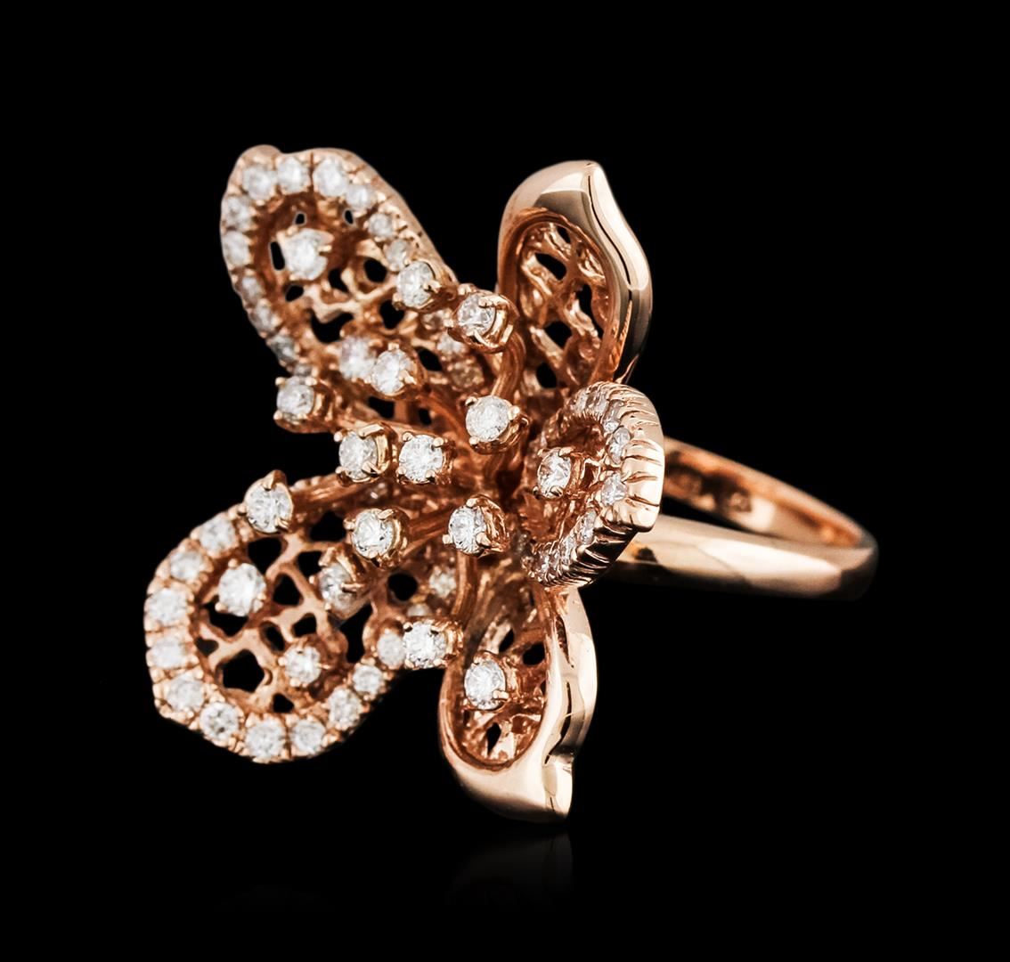 One electronically tested 14KT rose gold ladies cast diamond ring with a bright polish finish. Identified with markings of "14K". Condition is new. Containing: Sixty-Six prong set round brilliant cut diamonds, measuring 2.00 - 1.50 x 1.05mm (depth est.) approximate total weight of 66 Stones = 1.29ct. Clarity: SI-1 to I-1. Color: I - J. All diamonds are graded in the mounting, unless otherwise stated. Total Weight of Diamonds 1.29ct. Total Weight of Ring 12.30 grams. GGL Appraised at $5,160.00.