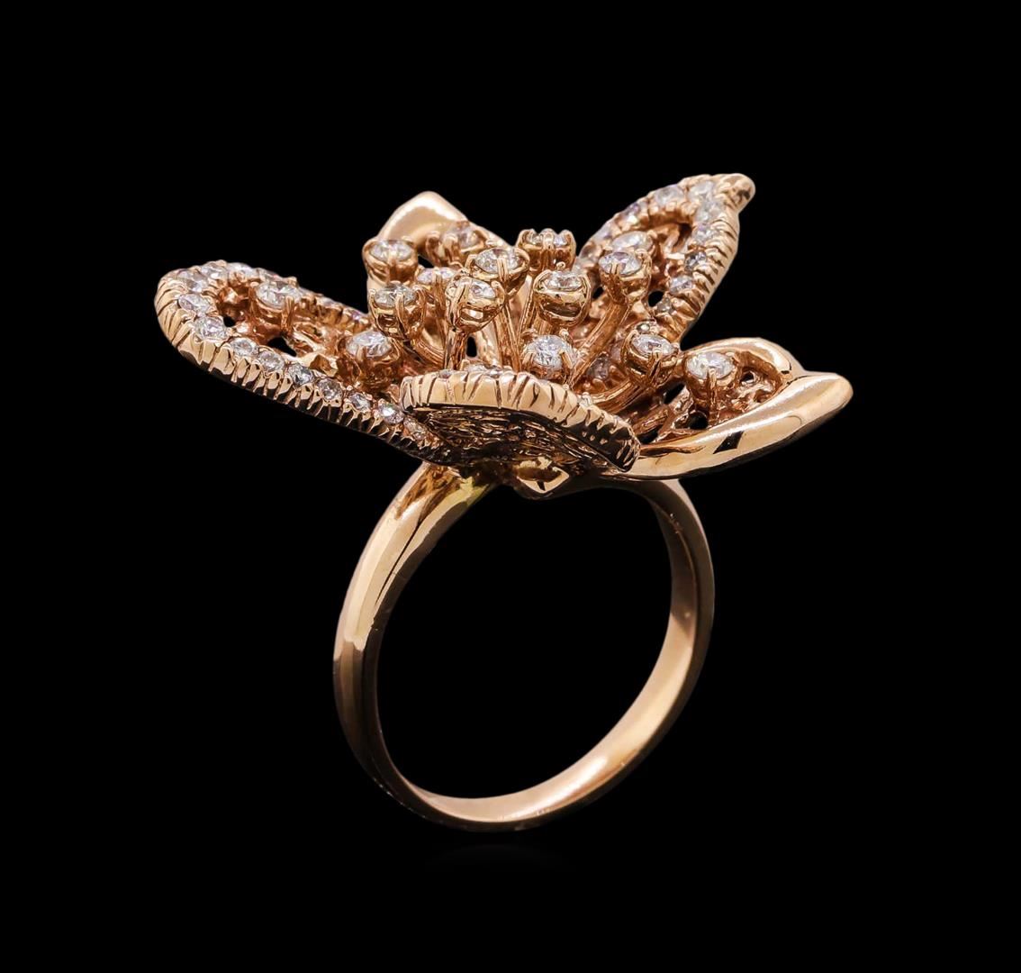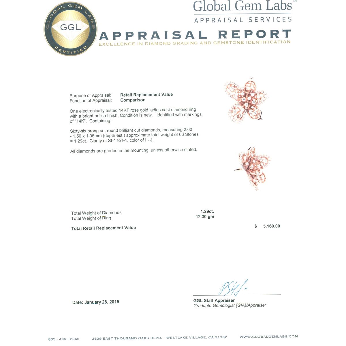 One electronically tested 14KT rose gold ladies cast diamond ring with a bright polish finish. Identified with markings of "14K". Condition is new. Containing: Sixty-Six prong set round brilliant cut diamonds, measuring 2.00 - 1.50 x 1.05mm (depth est.) approximate total weight of 66 Stones = 1.29ct. Clarity: SI-1 to I-1. Color: I - J. All diamonds are graded in the mounting, unless otherwise stated. Total Weight of Diamonds 1.29ct. Total Weight of Ring 12.30 grams. GGL Appraised at $5,160.00.