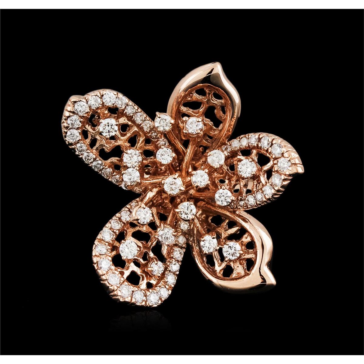 One electronically tested 14KT rose gold ladies cast diamond ring with a bright polish finish. Identified with markings of "14K". Condition is new. Containing: Sixty-Six prong set round brilliant cut diamonds, measuring 2.00 - 1.50 x 1.05mm (depth est.) approximate total weight of 66 Stones = 1.29ct. Clarity: SI-1 to I-1. Color: I - J. All diamonds are graded in the mounting, unless otherwise stated. Total Weight of Diamonds 1.29ct. Total Weight of Ring 12.30 grams. GGL Appraised at $5,160.00.