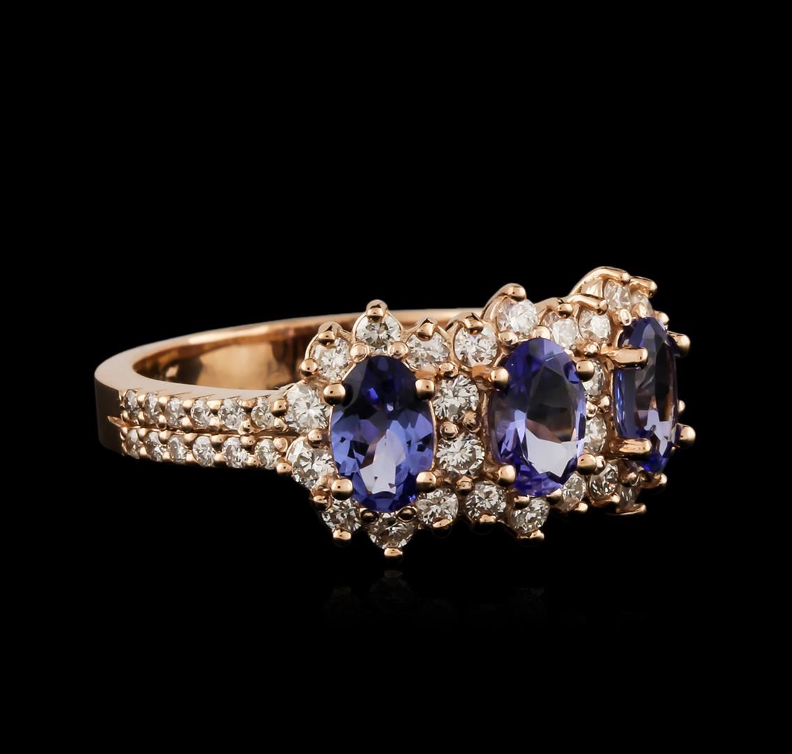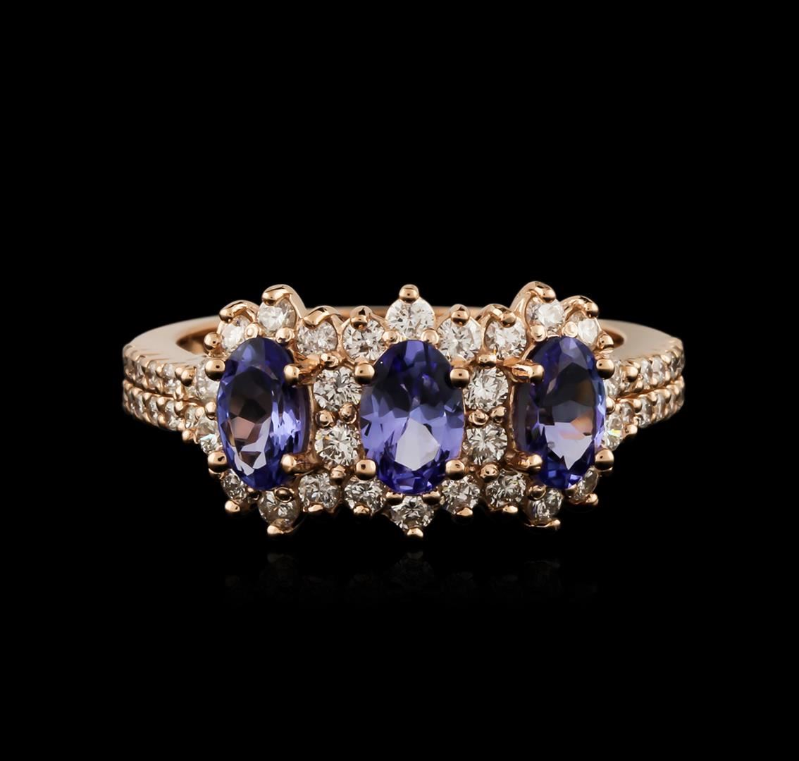 One electronically tested 14KT rose gold ladies cast tanzanite and diamond ring with a bright polish finish. Identified with markings of "14K". Condition is new. Containing: Three prong set oval modified brilliant cut natural tanzanites, measuring 6.00 x 4.00 x 2.60mm, approximate total weight of 1.32ct., clarity is eye clean, type I, medium light, very slightly grayish, violet color, (GIA V 4/3), cut is good. Forty-Eight prong set round brilliant cut diamonds, measuring 1.80 - 1.20 x 0.90mm (depth est.) approximate total weight of 48 Stones = 0.59ct. Clarity: SI-1 to I-1. Color: J - K, Cut is Good. Colored gemstones are presumed to have been subjected to commonly used enhancement processes. All diamonds and colored gemstones are graded in the mounting, unless otherwise stated. Total Weight of Colored Stones 1.32ct. Total Weight of Diamonds 0.59ct. Total Weight of Ring 4.00 grams. GGL Appraised at $2,670.00.