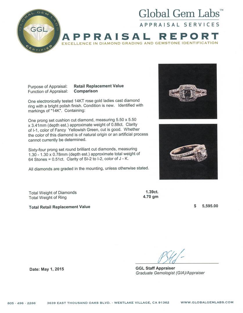 One electronically tested 14KT rose gold ladies cast diamond ring with a bright polish finish. Identified with markings of "14K". Condition is new. Containing: One prong set cushion cut diamond, measuring 5.50 x 5.50 x 3.41mm (depth est.) approximate weight of 0.88ct. Clarity: I-1, color of Fancy Yellowish Green, Cut is Good. Whether the color of this diamond is of natural origin or an artificial process cannot currently be determined. Sixty-Four prong set round brilliant cut diamonds, measuring 1.30 - 1.30 x 0.78mm (depth est.) approximate total weight of 64 Stones = 0.51ct. Clarity: SI-2 to I-2. Color: J - K. All diamonds are graded in the mounting, unless otherwise stated. Total Weight of Diamonds 1.39ct. Total Weight of Ring 4.70 grams. GGL Appraised at $5,595.00.