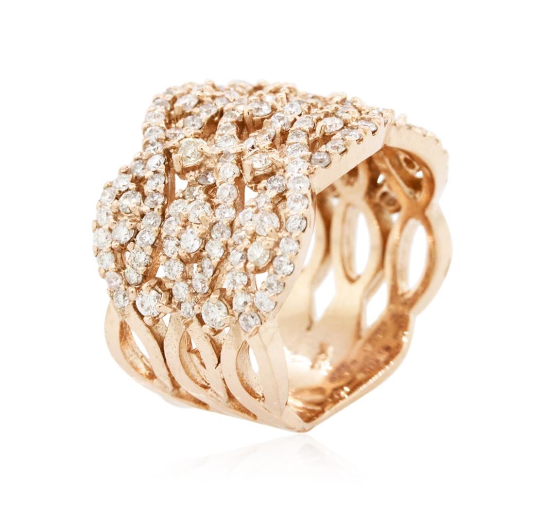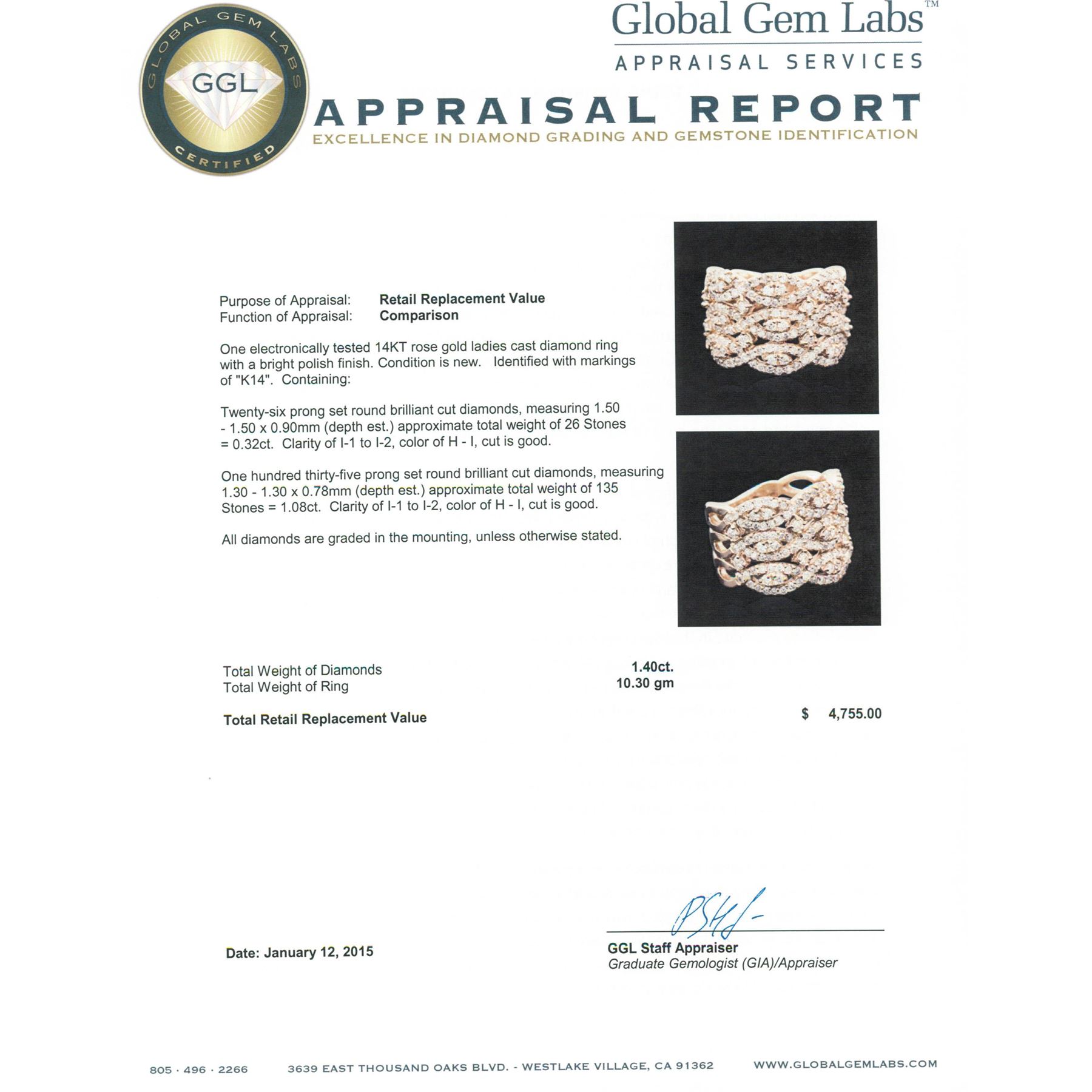 One electronically tested 14KT rose gold ladies cast diamond ring with a bright polish finish. Identified with markings of "K14". Condition is new. Containing: Twenty-Six prong set round brilliant cut diamonds, measuring 1.50 - 1.50 x 0.90mm (depth est.) approximate total weight of 26 Stones = 0.32ct. Clarity: I-1 to I-2. Color: H - I, Cut is Good. One Hundred Thirty-Five prong set round brilliant cut diamonds, measuring 1.30 - 1.30 x 0.78mm (depth est.) approximate total weight of 135 Stones = 1.08ct. Clarity: I-1 to I-2. Color: H - I, Cut is Good. All diamonds are graded in the mounting, unless otherwise stated. Total Weight of Diamonds 1.40ct. Total Weight of Ring 10.30 grams. GGL Appraised.