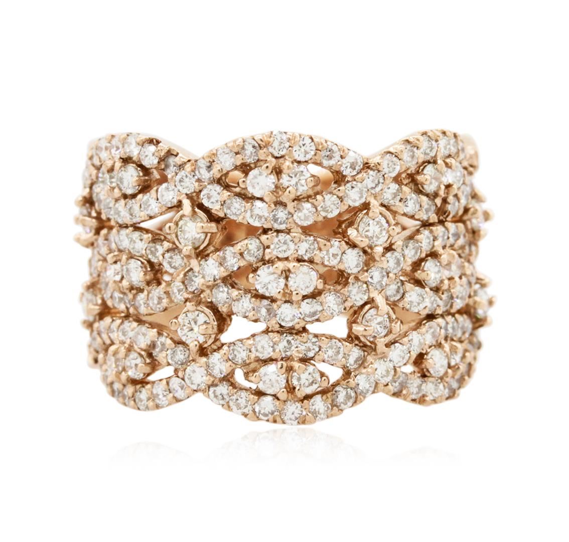 One electronically tested 14KT rose gold ladies cast diamond ring with a bright polish finish. Identified with markings of "K14". Condition is new. Containing: Twenty-Six prong set round brilliant cut diamonds, measuring 1.50 - 1.50 x 0.90mm (depth est.) approximate total weight of 26 Stones = 0.32ct. Clarity: I-1 to I-2. Color: H - I, Cut is Good. One Hundred Thirty-Five prong set round brilliant cut diamonds, measuring 1.30 - 1.30 x 0.78mm (depth est.) approximate total weight of 135 Stones = 1.08ct. Clarity: I-1 to I-2. Color: H - I, Cut is Good. All diamonds are graded in the mounting, unless otherwise stated. Total Weight of Diamonds 1.40 ct. Total Weight of Ring 10.30 grams. GGL Appraised.