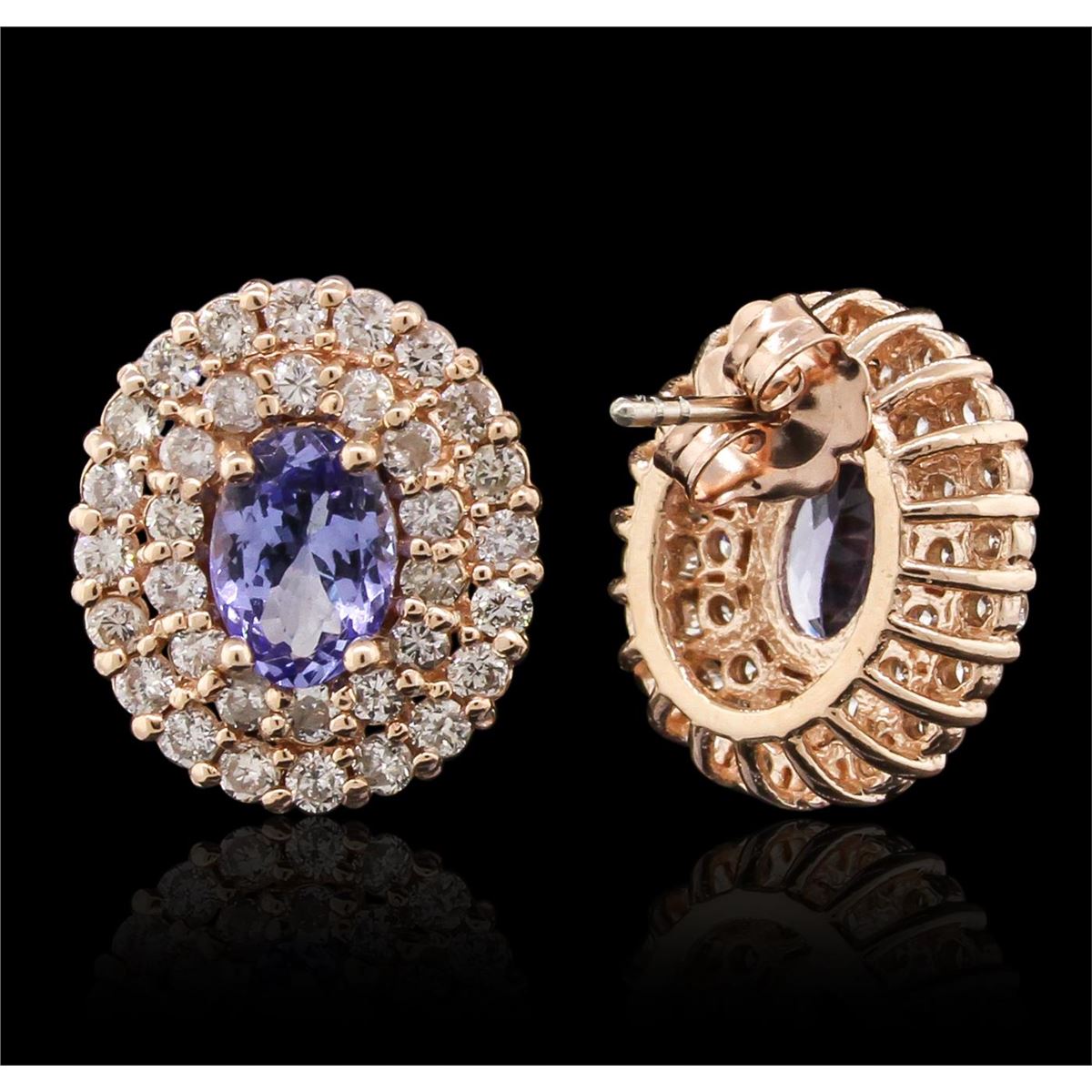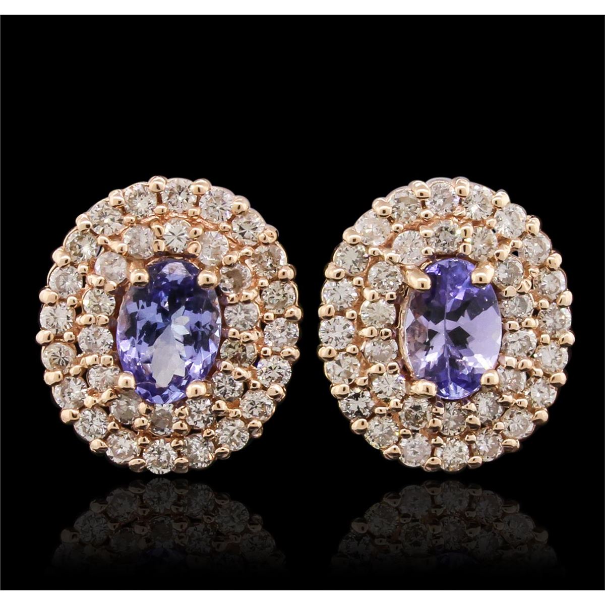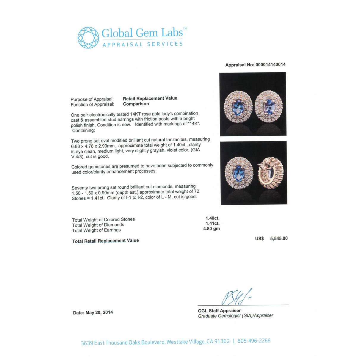 One pair electronically tested 14KT rose gold Ladies combination cast & assembled stud earrings with friction posts with a bright polish finish. Condition is new. Identified with markings of "14K". Containing: Two prong set oval modified brilliant cut natural tanzanites, measuring 6.88 x 4.78 x 2.90mm, approximate. Total Weight of 1.40ct., clarity is eye clean, medium light, very slightly grayish, violet color, (GIA V 4/3), cut is good. Colored gemstones are presumed to have been subjected to commonly used color/clarity enhancement processes. Seventy-Two prong set round brilliant cut diamonds, measuring 1.50 - 1.50 x 0.90mm (depth est.) approximate. Total Weight of 72 Stones = 1.41ct. Clarity: I-1 to I-2. Color: L - M, Cut is Good. Total Weight of Colored Stones 1.40ct. Total Weight of Diamonds 1.41ct. Total Weight of Earrings 4.80 grams. GGL Appraised at $5,545.00.