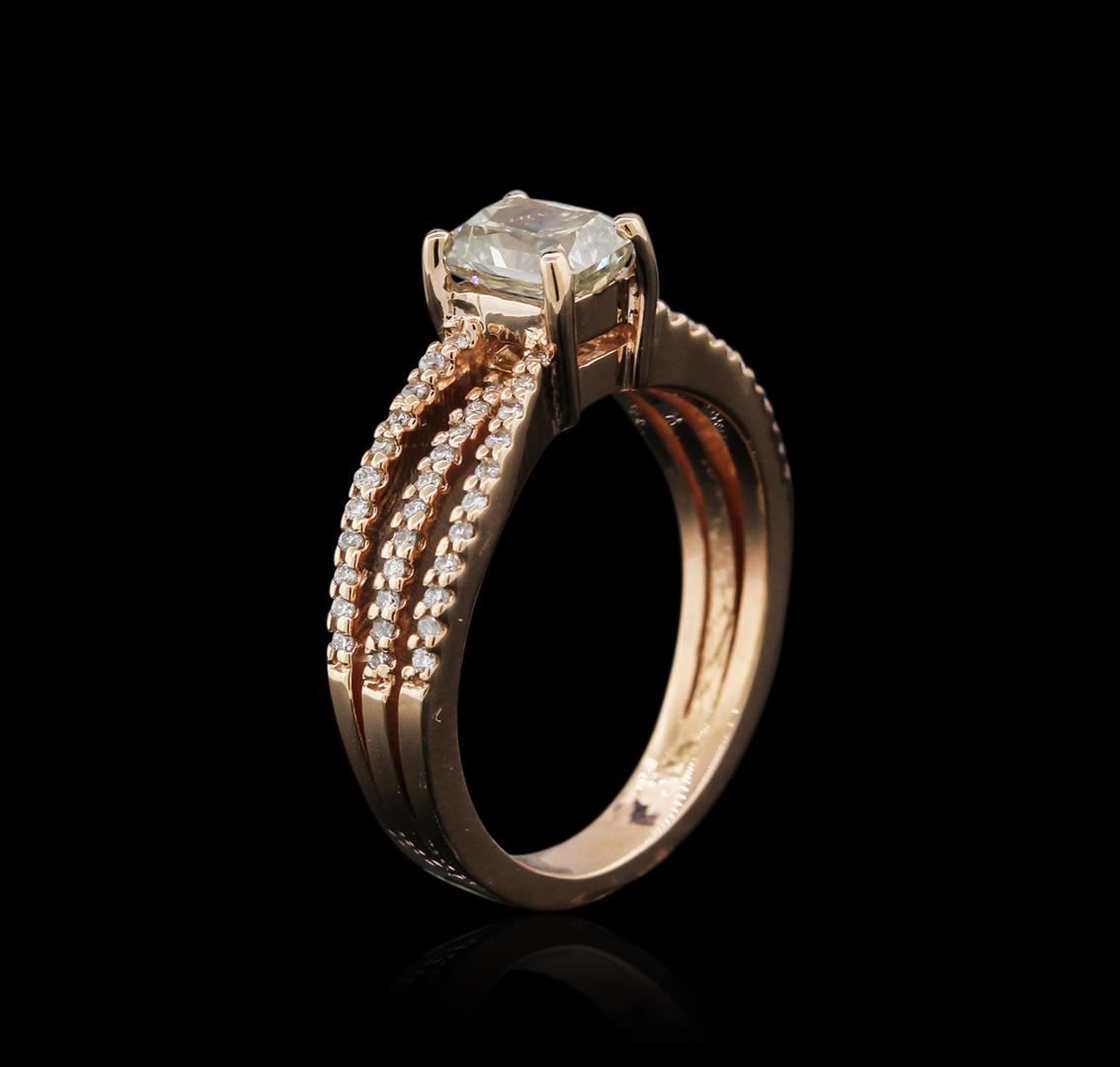 One electronically tested 14KT rose gold ladies cast diamond ring with a bright polish finish. Identified with markings of "14K". Condition is new. Containing: One prong set radiant shaped cut diamond, measuring 6.50 x 5.00 x 3.76mm (depth est.) approximate weight of 1.00ct. Clarity: SI-1, color of Fancy Light Green, Cut is Good. Whether the color of this diamond is of natural origin or an artificial process cannot currently be determined. Sixty-Six prong set round brilliant cut diamonds, measuring 1.20 - 1.20 x 0.72mm (depth est.) approximate total weight of 66 Stones = 0.42ct. Clarity: I-1 to I-2. Color: J - K, Cut is Good. All diamonds are graded in the mounting, unless otherwise stated. One cut approximate weight of 0.00ct.Total Weight of Diamonds 1.42ct. Total Weight of Ring 5.40 grams. GGL Appraised at $4,735.00.