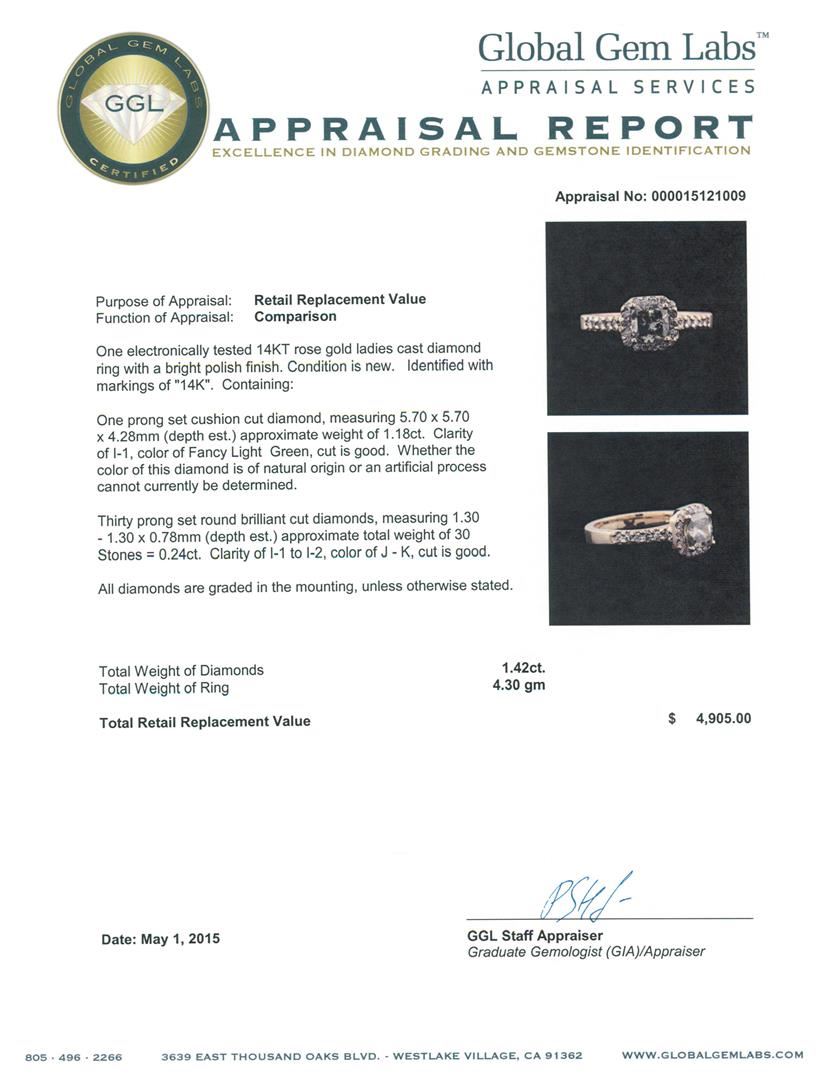 One electronically tested 14KT rose gold ladies cast diamond ring with a bright polish finish. Identified with markings of "14K". Condition is new. Containing: One prong set cushion cut diamond, measuring 5.70 x 5.70 x 4.28mm (depth est.) approximate weight of 1.18ct. Clarity: I-1, color of Fancy Light Green, Cut is Good. Whether the color of this diamond is of natural origin or an artificial process cannot currently be determined. Thirty prong set round brilliant cut diamonds, measuring 1.30 - 1.30 x 0.78mm (depth est.) approximate total weight of 30 Stones = 0.24ct. Clarity: I-1 to I-2. Color: J - K, Cut is Good. All diamonds are graded in the mounting, unless otherwise stated. Total Weight of Diamonds 1.42ct. Total Weight of Ring 4.30 grams. GGL Appraised at $4,905.00.
