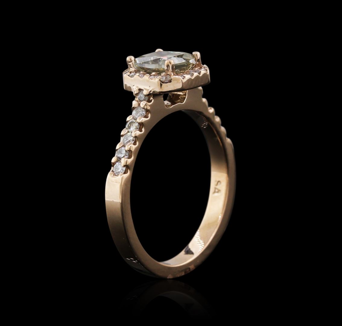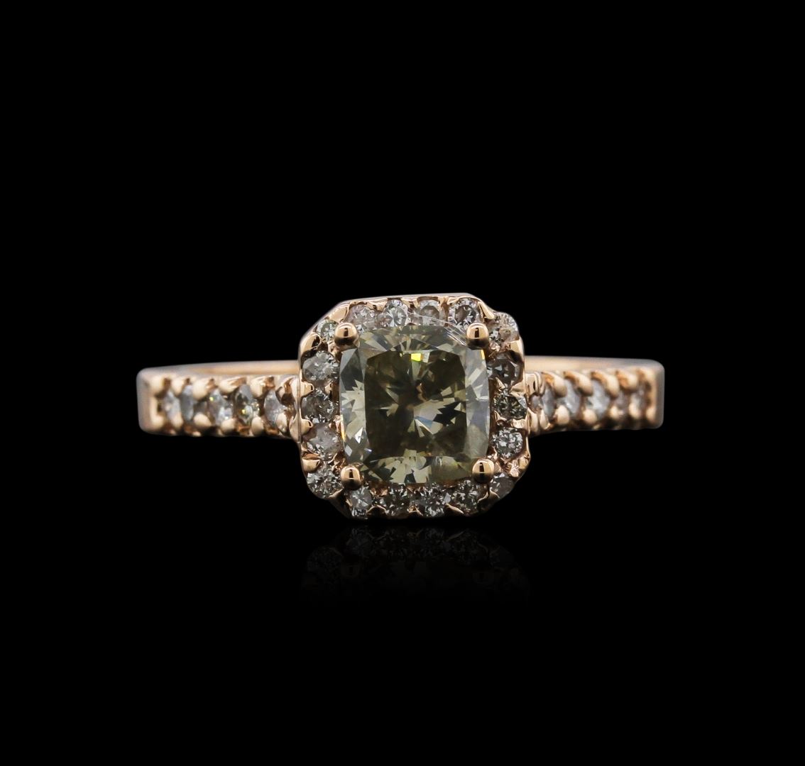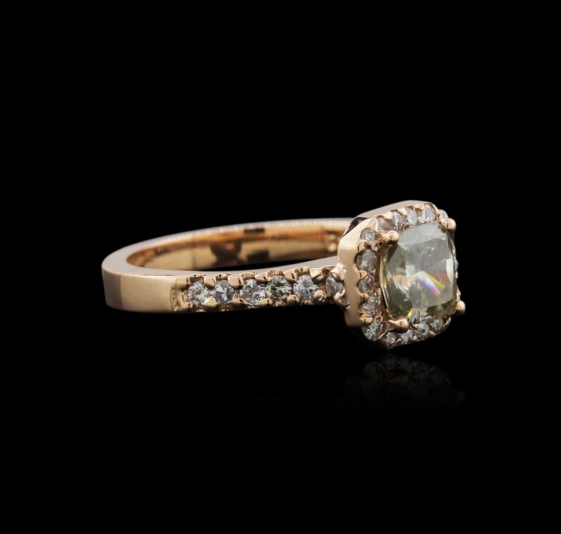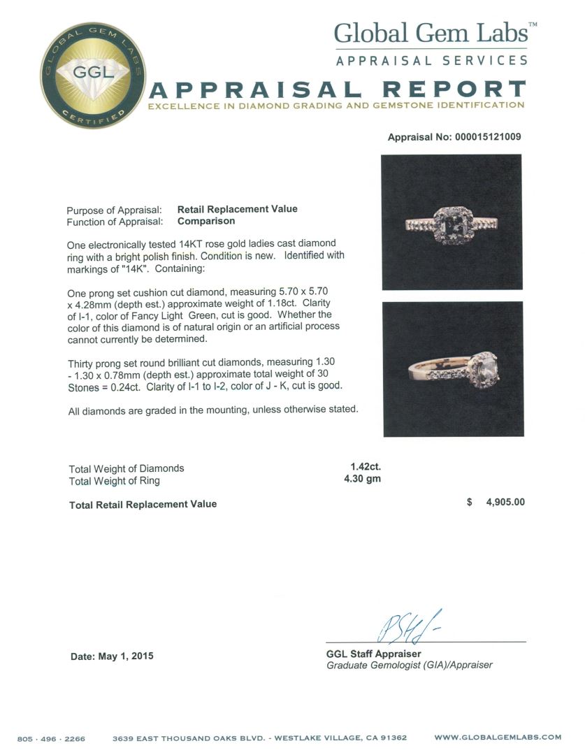 One electronically tested 14KT rose gold ladies cast diamond ring with a bright polish finish. Identified with markings of "14K". Condition is new. Containing: One prong set cushion cut diamond, measuring 5.70 x 5.70 x 4.28mm (depth est.) approximate weight of 1.18ct. Clarity: I-1, color of Fancy Light Green, Cut is Good. Whether the color of this diamond is of natural origin or an artificial process cannot currently be determined. Thirty prong set round brilliant cut diamonds, measuring 1.30 - 1.30 x 0.78mm (depth est.) approximate total weight of 30 Stones = 0.24ct. Clarity: I-1 to I-2. Color: J - K, Cut is Good. All diamonds are graded in the mounting, unless otherwise stated. Total Weight of Diamonds 1.42ct. Total Weight of Ring 4.30 grams. GGL Appraised at $4,905.00.