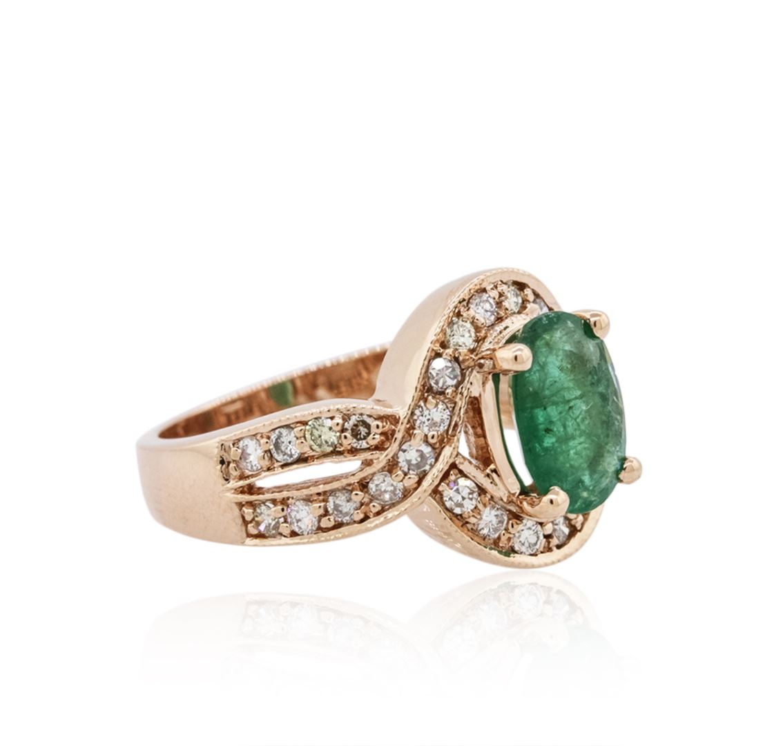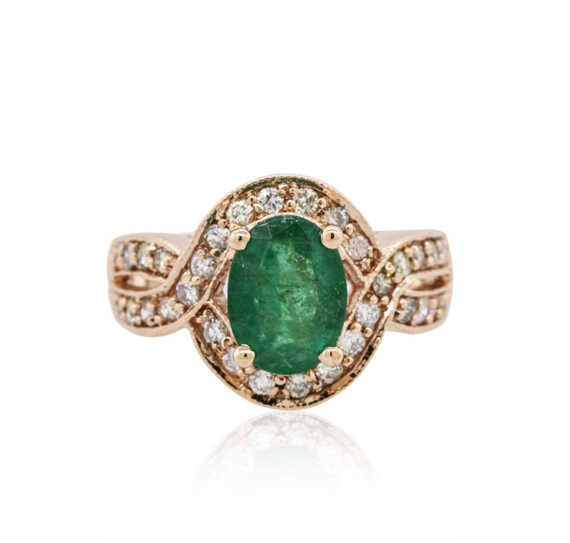 One ring featuring: 14KT rose gold weighing 6.40 grams containing one prong set oval cut emerald with a total weight of 1.47ct and pave set round cut diamonds with a total weight of 0.56cts.