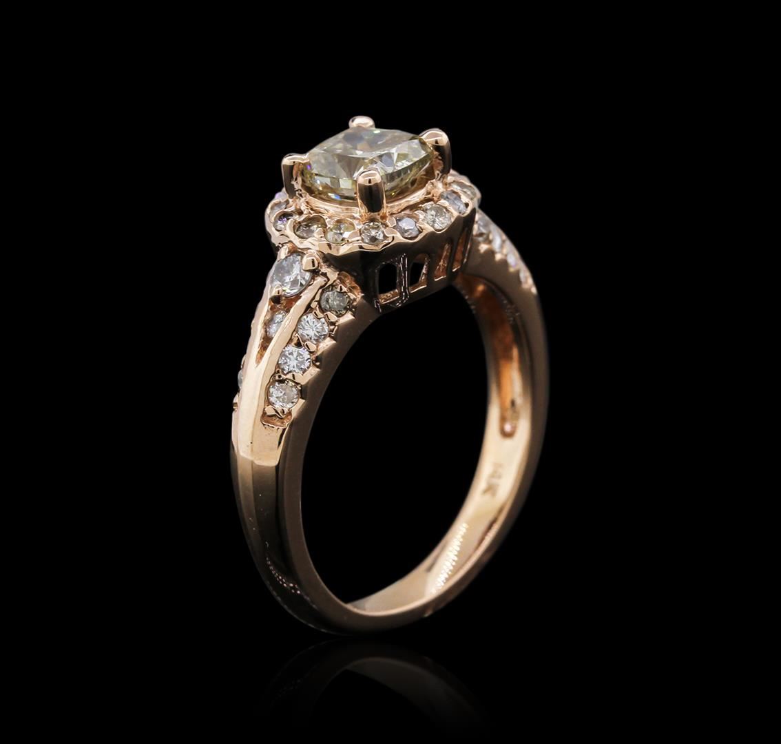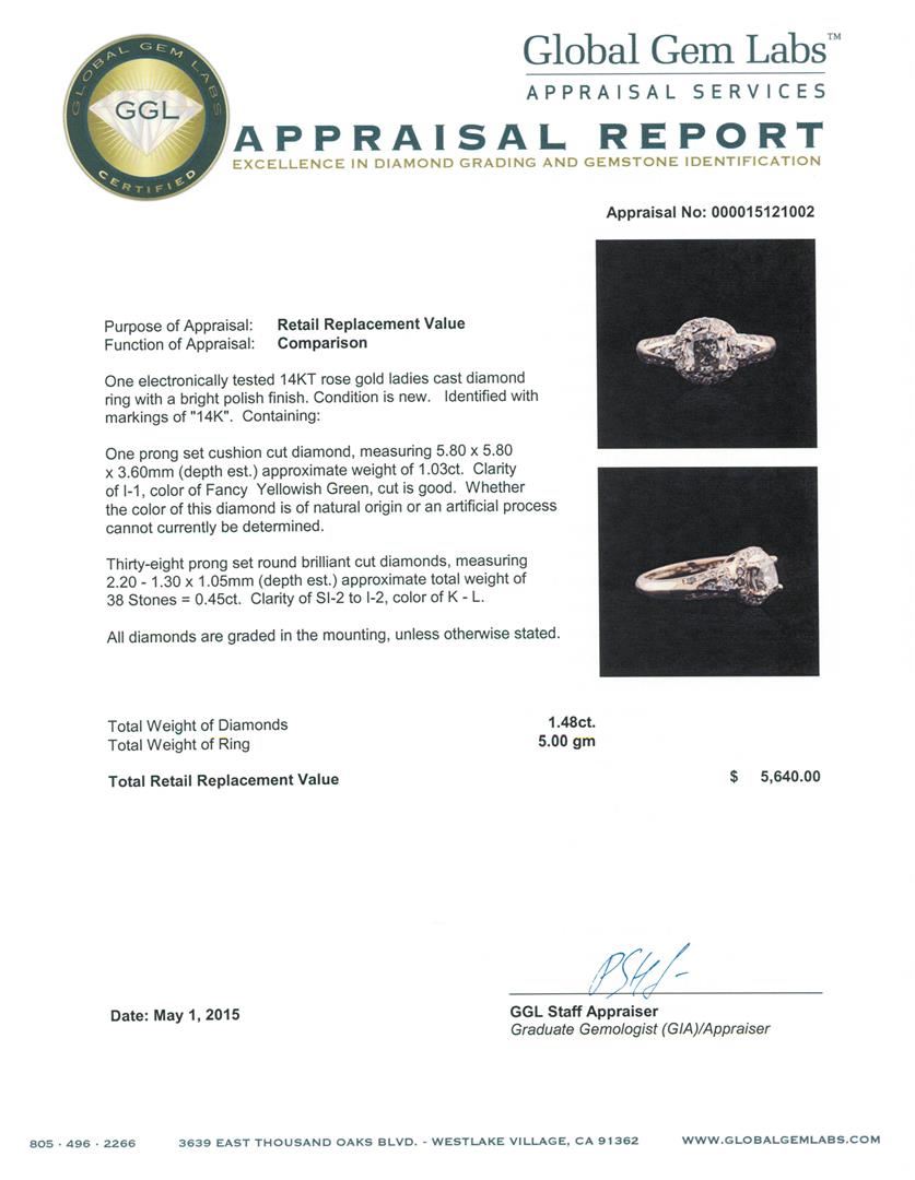 One electronically tested 14KT rose gold ladies cast diamond ring with a bright polish finish. Identified with markings of "14K". Condition is new. Containing: One prong set cushion cut diamond, measuring 5.80 x 5.80 x 3.60mm (depth est.) approximate weight of 1.03ct. Clarity: I-1, color of Fancy Yellowish Green, Cut is Good. Whether the color of this diamond is of natural origin or an artificial process cannot currently be determined. Thirty-Eight prong set round brilliant cut diamonds, measuring 2.20 - 1.30 x 1.05mm (depth est.) approximate total weight of 38 Stones = 0.45ct. Clarity: SI-2 to I-2. Color: K - L. All diamonds are graded in the mounting, unless otherwise stated. Total Weight of Diamonds 1.48ct. Total Weight of Ring 5.00 grams. GGL Appraised at $5,640.00.