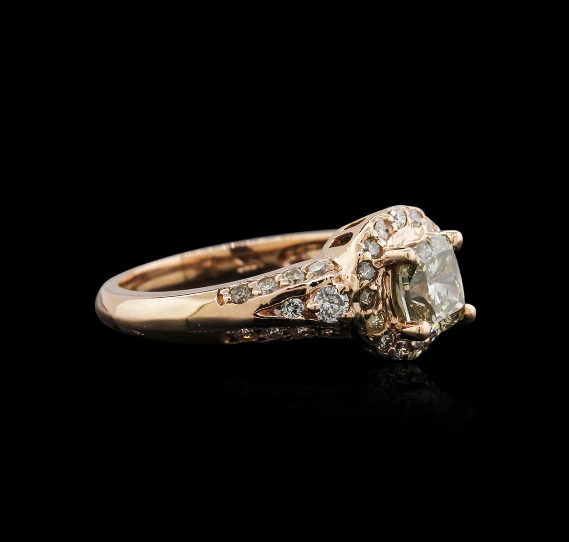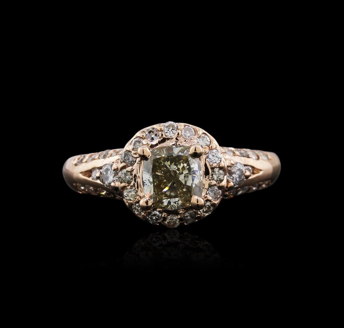 One electronically tested 14KT rose gold ladies cast diamond ring with a bright polish finish. Identified with markings of "14K". Condition is new. Containing: One prong set cushion cut diamond, measuring 5.80 x 5.80 x 3.60mm (depth est.) approximate weight of 1.03ct. Clarity: I-1, color of Fancy Yellowish Green, Cut is Good. Whether the color of this diamond is of natural origin or an artificial process cannot currently be determined. Thirty-Eight prong set round brilliant cut diamonds, measuring 2.20 - 1.30 x 1.05mm (depth est.) approximate total weight of 38 Stones = 0.45ct. Clarity: SI-2 to I-2. Color: K - L. All diamonds are graded in the mounting, unless otherwise stated. Total Weight of Diamonds 1.48ct. Total Weight of Ring 5.00 grams. GGL Appraised at $5,640.00.