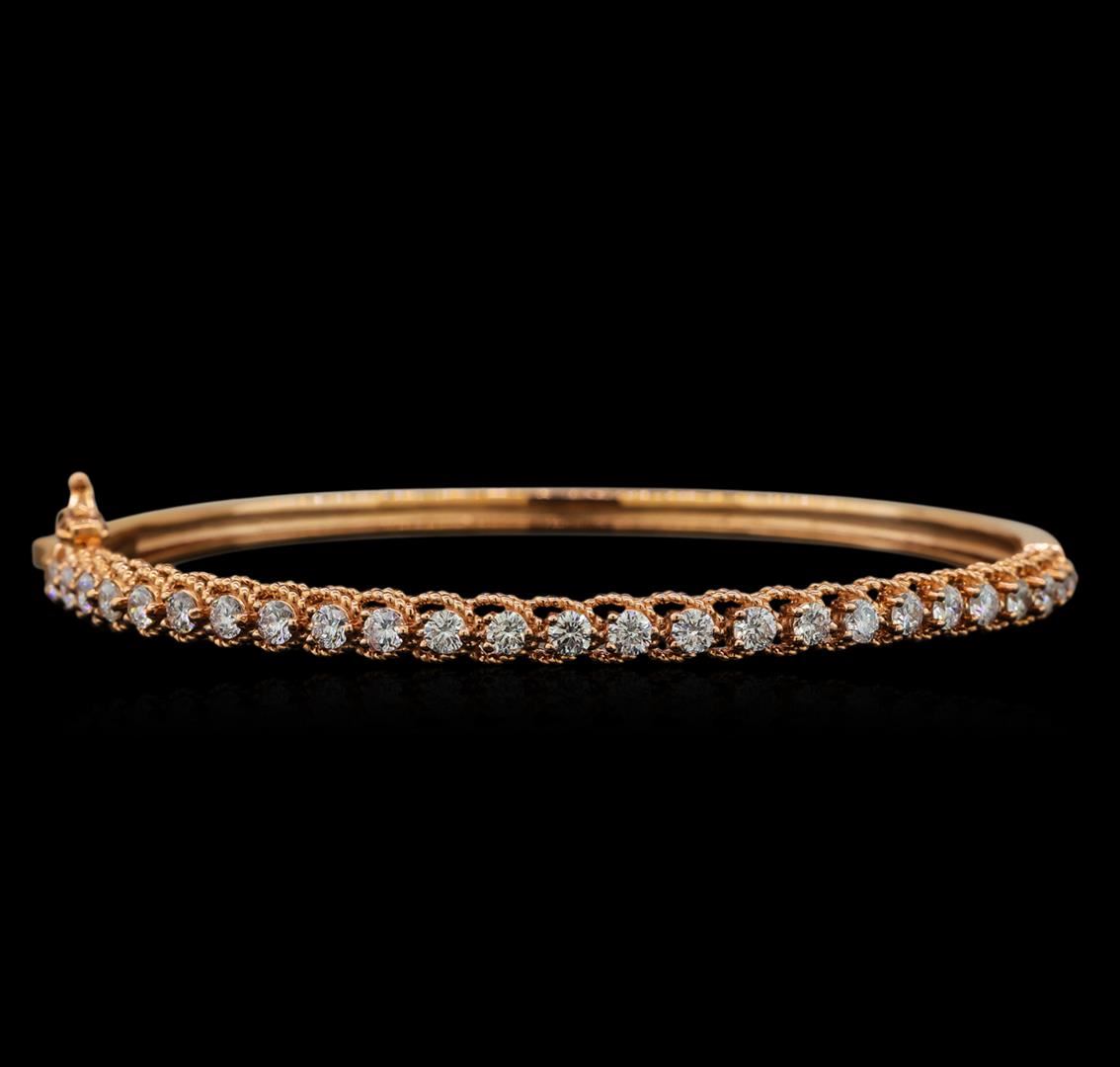 One electronically tested 14KT rose gold ladies cast diamond bangle bracelet with a hidden box clasp with safety closer with a bright polish finish. Identified with markings of "14K". Condition is new. Containing: Twenty-Five prong set round brilliant cut diamonds, measuring 2.50 - 2.50 x 1.50mm (depth est.) approximate total weight of 25 Stones = 1.59ct. Clarity: SI-1 to SI-2. Color: H - I, Cut is Good. All diamonds are graded in the mounting, unless otherwise stated. Total Weight of Diamonds 1.59ct. Total Weight of Bangle Bracelet 11.00 grams. GGL Appraised at $5,080.00.