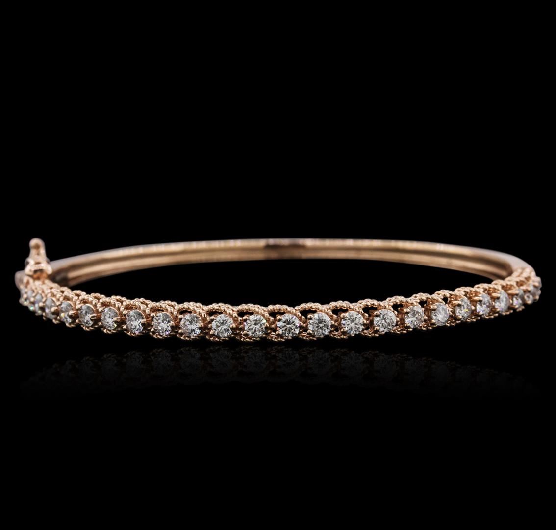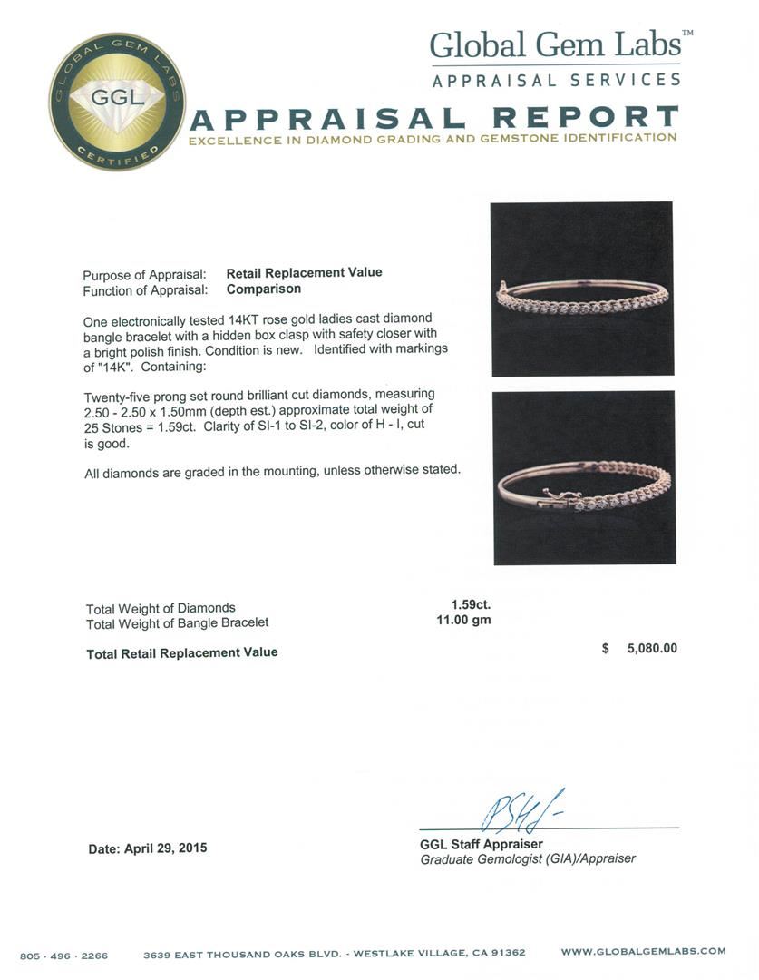 One electronically tested 14KT rose gold ladies cast diamond bangle bracelet with a hidden box clasp with safety closer with a bright polish finish. Identified with markings of "14K". Condition is new. Containing: Twenty-Five prong set round brilliant cut diamonds, measuring 2.50 - 2.50 x 1.50mm (depth est.) approximate total weight of 25 Stones = 1.59ct. Clarity: SI-1 to SI-2. Color: H - I, Cut is Good. All diamonds are graded in the mounting, unless otherwise stated. Total Weight of Diamonds 1.59ct. Total Weight of Bangle Bracelet 11.00 grams. GGL Appraised at $5,080.00.